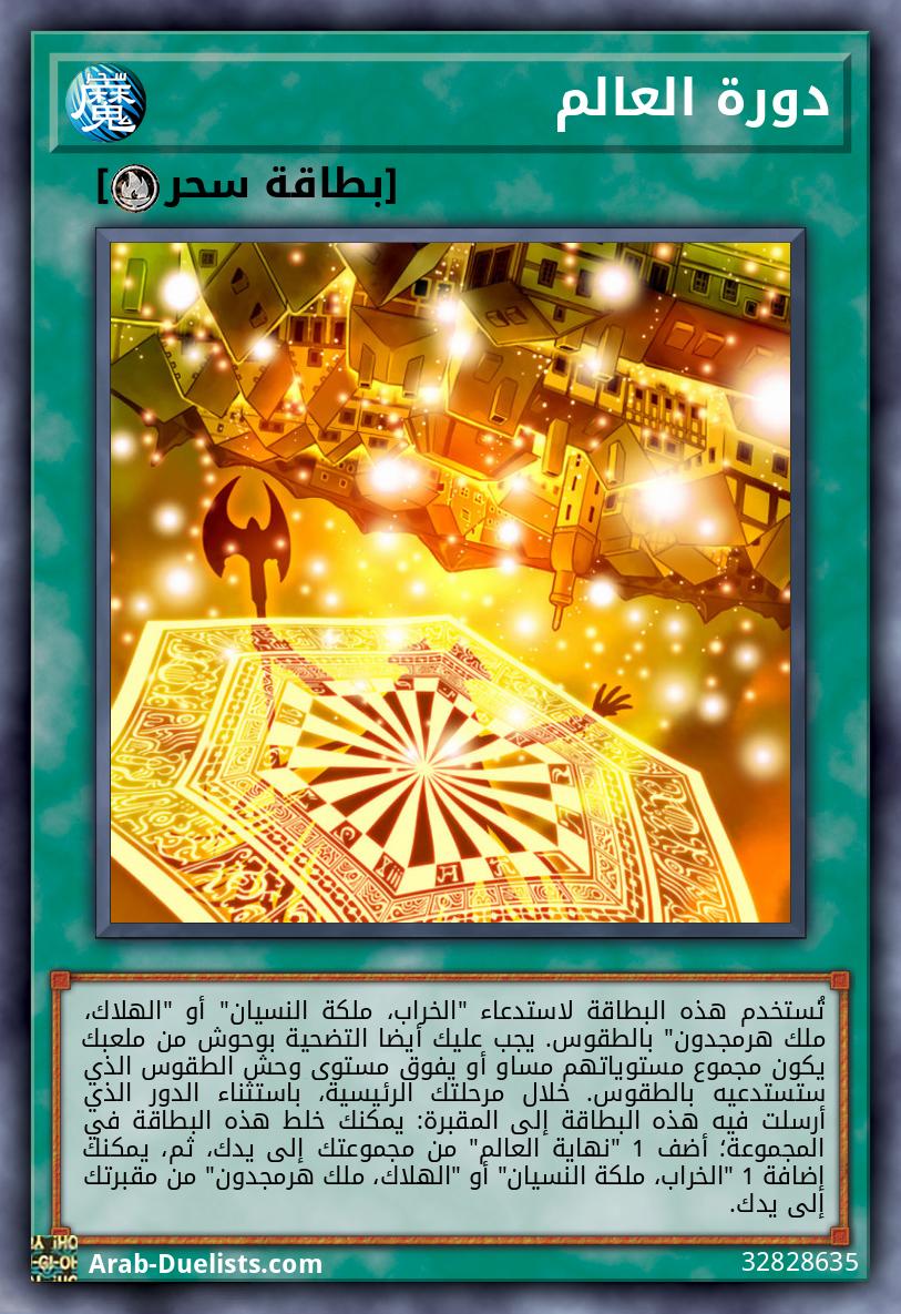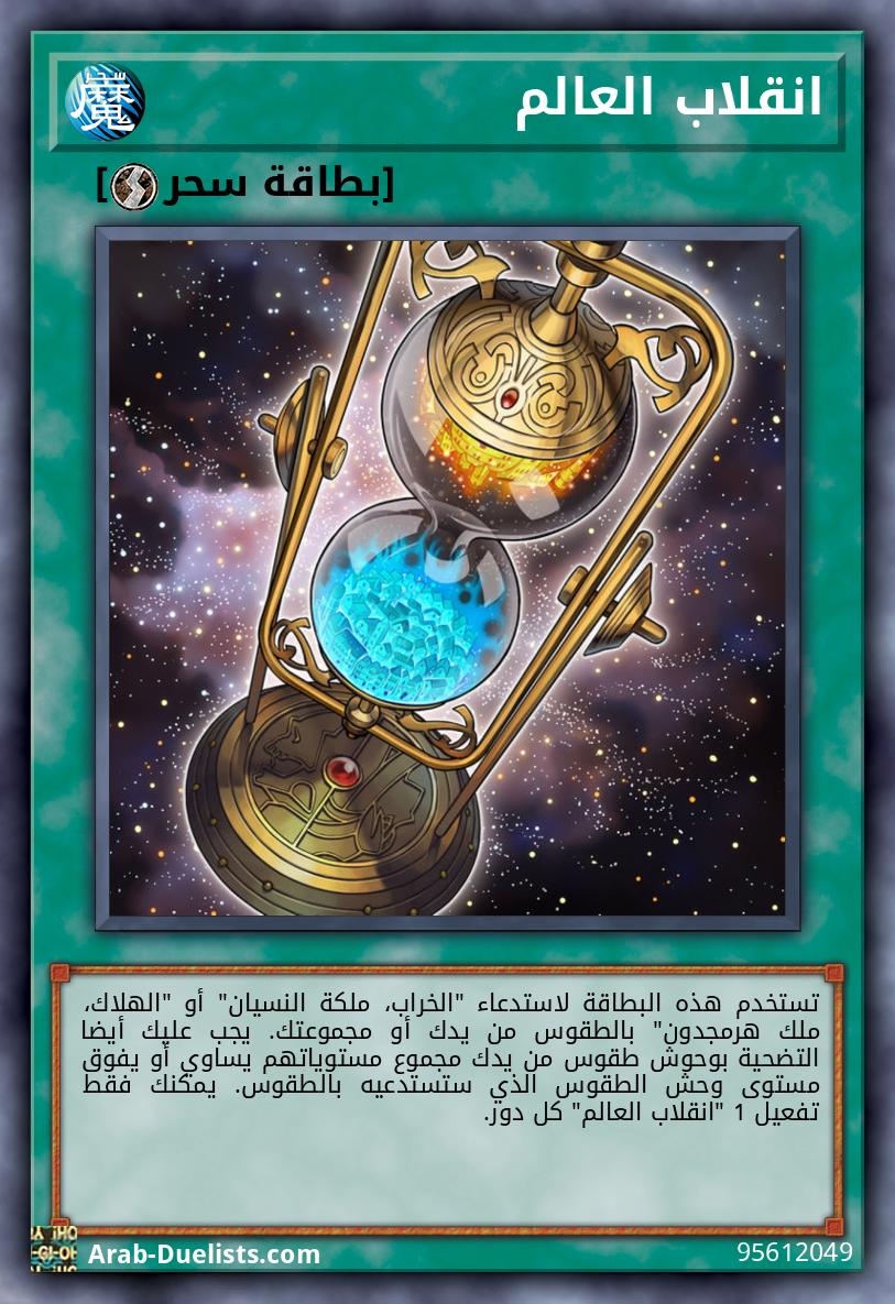 تستخدم هذه البطاقة لاستدعاء "الخراب، ملكة النسيان" أو "الهلاك، ملك هرمجدون" بالطقوس من يدك أو مجموعتك. يجب عليك أيضا التضحية بوحوش طقوس من يدك مجموع مستوياتهم يساوي أو يفوق مستوى وحش الطقوس الذي ستستدعيه بالطقوس. يمكنك فقط تفعيل 1 "انقلاب العالم" كل دور.
