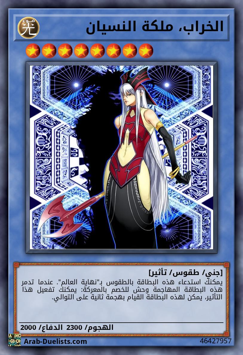 يمكن استدعاء هذه البطاقة بالطقوس بـ"دورة العالم". يصبح اسم هذه البطاقة "الخراب، ملكة النسيان" بينما هي في اليد أو في الملعب. بينما هذه البطاقة المستدعاة بالطقوس في الملعب، لا يمكن تدمير وحوش الطقوس التي تتحكم بها بتأثيرات البطاقات. إذا كانت جميع الوحوش المستخدمة لاستدعاء هذه البطاقة بالطقوس وحوش طقوس، يمكنها القيام بهجوم ثان خلال كل مرحلة معركة. إذا دمرت هذه البطاقة وحشا للخصم بالمعركة: يمكنك إلحاق ضرر بخصمك مساو لنقاط الهجوم الأصلية لذلك الوحش المدمر.