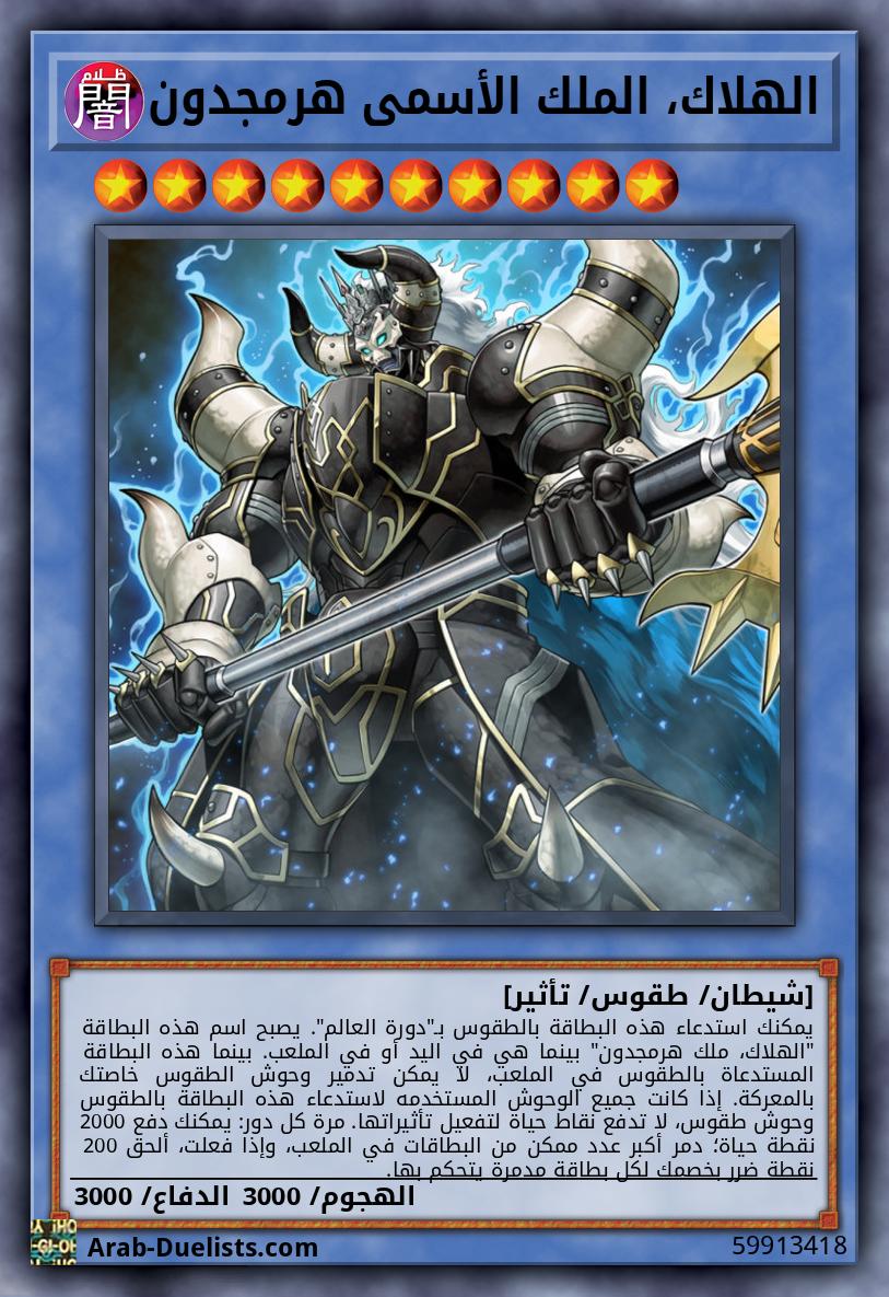 يمكنك استدعاء هذه البطاقة بالطقوس بـ"دورة العالم". يصبح اسم هذه البطاقة "الهلاك، ملك هرمجدون" بينما هي في اليد أو في الملعب. بينما هذه البطاقة المستدعاة بالطقوس في الملعب، لا يمكن تدمير وحوش الطقوس خاصتك بالمعركة. إذا كانت جميع الوحوش المستخدمه لاستدعاء هذه البطاقة بالطقوس وحوش طقوس، لا تدفع نقاط حياة لتفعيل تأثيراتها. مرة كل دور: يمكنك دفع 2000 نقطة حياة؛ دمر أكبر عدد ممكن من البطاقات في الملعب، وإذا فعلت، ألحق 200 نقطة ضرر بخصمك لكل بطاقة مدمرة يتحكم بها.