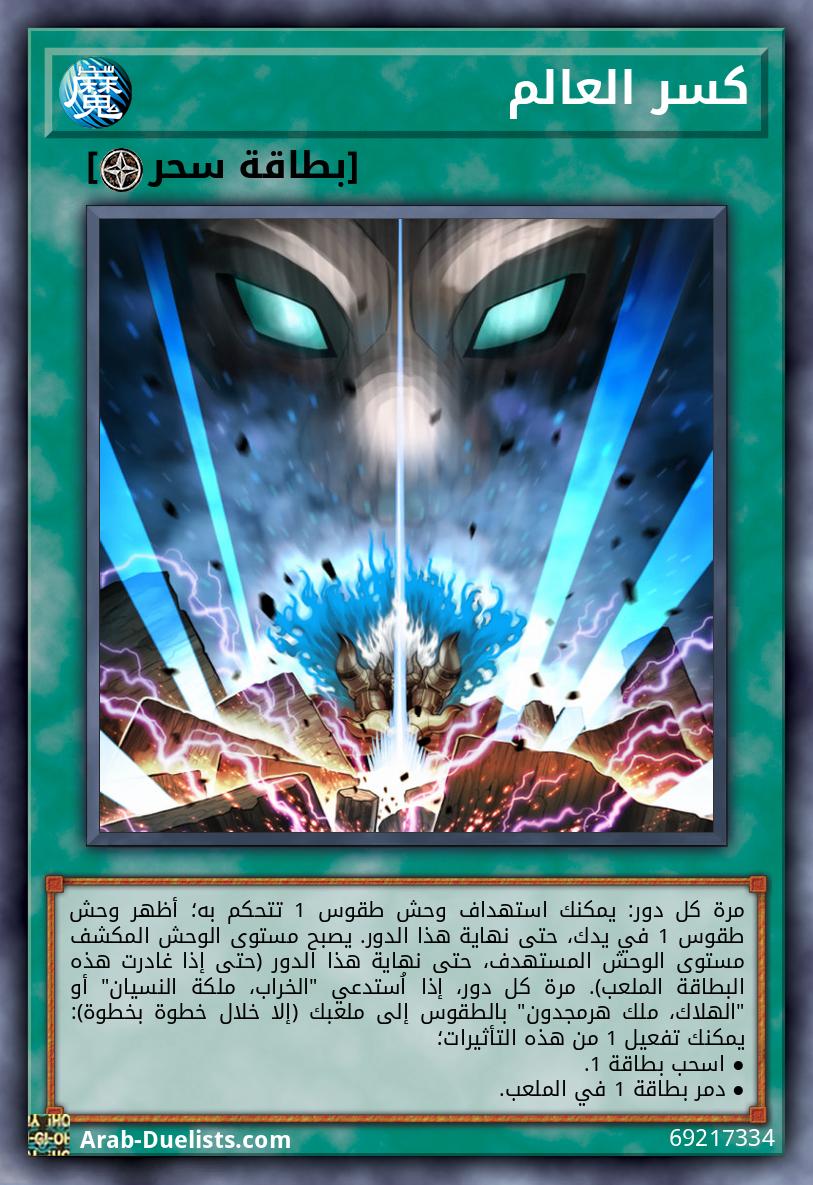 يمكنك استدعاء هذه البطاقة بالطقوس بـ"نهاية العالم". يمكنك دفع 2000 نقطة حياة؛ دمر كل البطاقات الأخرى في الملعب.