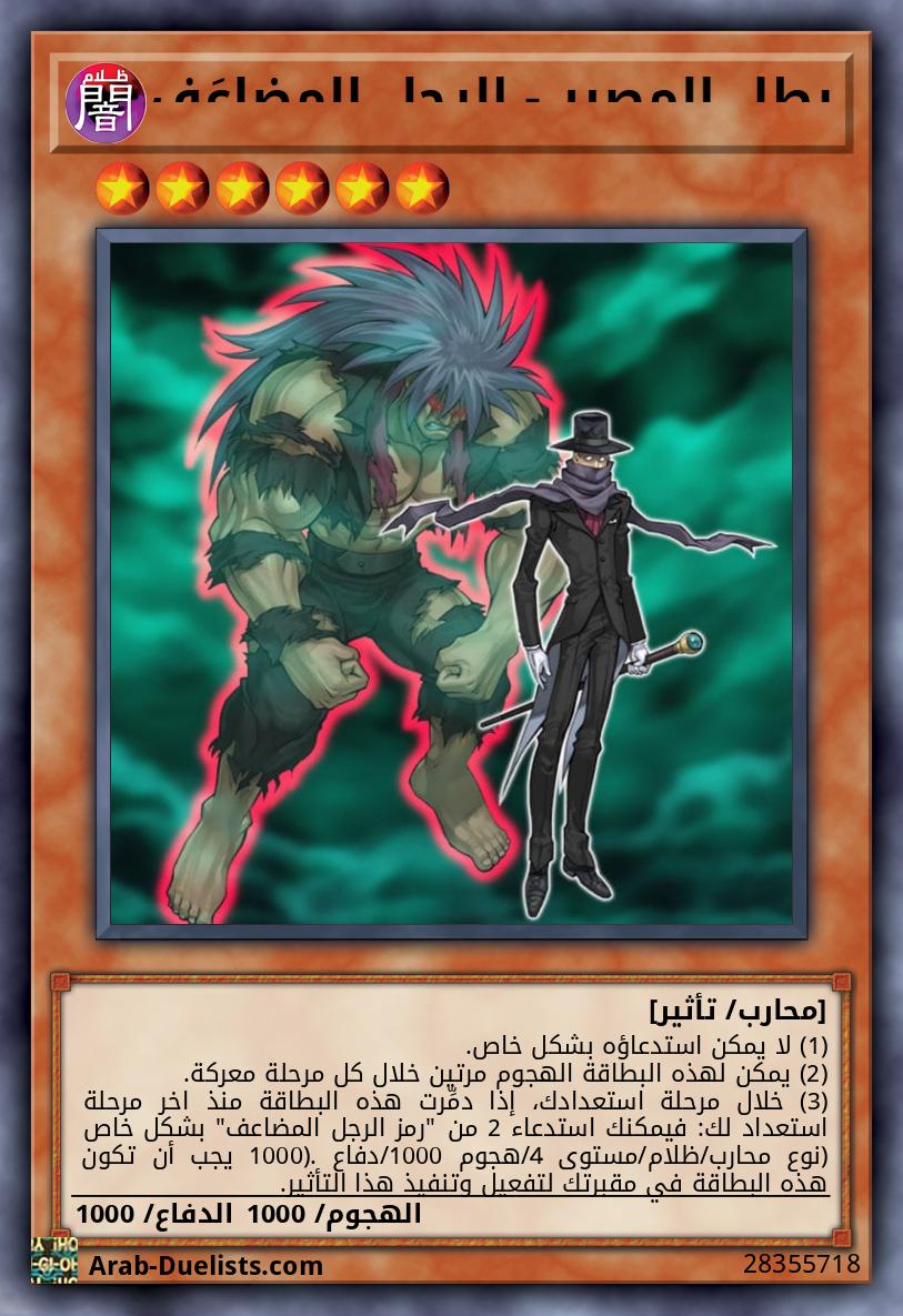 (1) لا يمكن استدعاؤه بشكل خاص. (2) يمكن لهذه البطاقة الهجوم مرتين خلال كل مرحلة معركة. (3) خلال مرحلة استعدادك، إذا دمِّرت هذه البطاقة منذ اخر مرحلة استعداد لك: فيمكنك استدعاء 2 من "رمز الرجل المضاعف" بشكل خاص (نوع محارب/ظلام/مستوى 4/هجوم 1000/دفاع 1000). يجب أن تكون هذه البطاقة في مقبرتك لتفعيل وتنفيذ هذا التأثير.