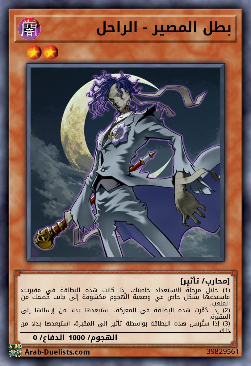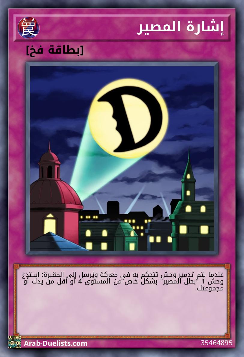عندما يتم تدمير وحش تتحكم به في معركة ويُرسَل إلى المقبرة: استدع وحش 1 "بطل المصير" بشكل خاص من المستوى 4 أو أقل من يدك أو مجموعتك.