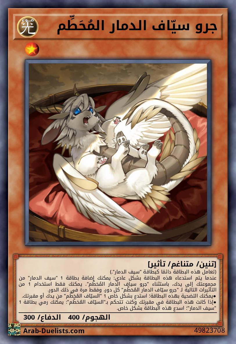يمكنك استهداف 1 "السيّاف المُحَطِّم" تتحكم به؛ جهّز هذه البطاقة من يدك أو ملعبك لذلك الهدف. بينما هذه البطاقة مجهّزة لوحش، لا يمكن لخصمك استدعاء وحوش بشكل خاص من المجموعة الإضافية. بينما هذه البطاقة مجهّزة لوحش: يمكنك استدعاء هذه البطاقة المجهّزة بشكل خاص. يمكنك فقط استخدام كل تأثير لـ"التنين المُحَطِّم، سيف الدمار" مرة كل دور.