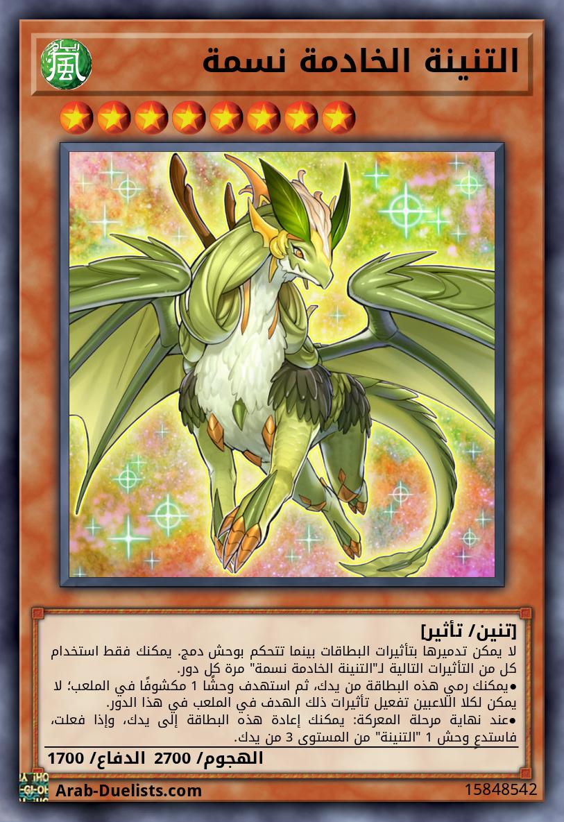 لا يمكن تدميرها بتأثيرات البطاقات بينما تتحكم بوحش دمج. يمكنك فقط استخدام كل من التأثيرات التالية لـ"التنينة الخادمة نسمة" مرة كل دور. ●يمكنك رمي هذه البطاقة من يدك، ثم استهدف وحشًا 1 مكشوفًا في الملعب؛ لا يمكن لكلا اللاعبين تفعيل تأثيرات ذلك الهدف في الملعب في هذا الدور. ●عند نهاية مرحلة المعركة: يمكنك إعادة هذه البطاقة إلى يدك، وإذا فعلت، فاستدعِ وحش 1 "التنينة" من المستوى 3 من يدك.