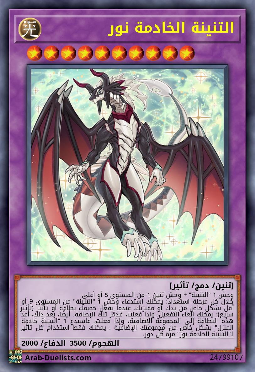 وحش 1 "التنينة" + وحش تنين 1 من المستوى 5 أو أعلى خلال كل مرحلة استعداد: يمكنك استدعاء وحش 1 "التنينة" من المستوى 9 أو أقل بشكل خاص من يدك أو مقبرتك. عندما يفعّل خصمك بطاقة أو تأثير (تأثير سريع): يمكنك إلغاء التفعيل، وإذا فعلت، فدمّر تلك البطاقة، أيضًا، بعد ذلك، أعد هذه البطاقة إلى المجموعة الإضافية، وإذا فعلت، فاستدعِ 1 "التنينة خادمة المنزل" بشكل خاص من مجموعتك الإضافية . يمكنك فقط استخدام كل تأثير لـ"التنينة الخادمة نور" مرة كل دور.