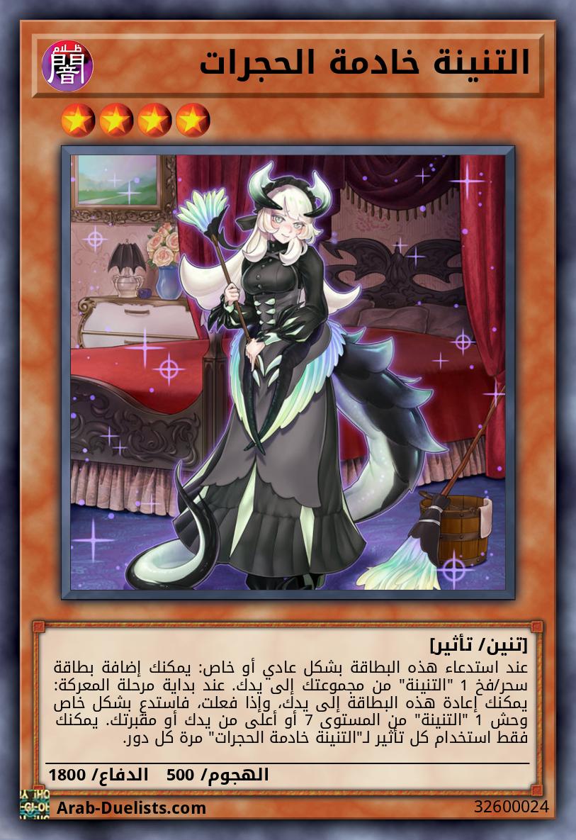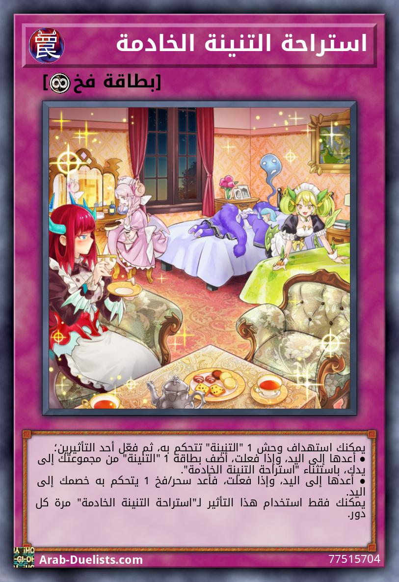 عند استدعاء هذه البطاقة بشكل عادي أو خاص: يمكنك إضافة بطاقة سحر/فخ 1 "التنينة" من مجموعتك إلى يدك. عند بداية مرحلة المعركة: يمكنك إعادة هذه البطاقة إلى يدك، وإذا فعلت، فاستدعِ بشكل خاص وحش 1 "التنينة" من المستوى 7 أو أعلى من يدك أو مقبرتك. يمكنك فقط استخدام كل تأثير لـ"التنينة خادمة الحجرات" مرة كل دور.