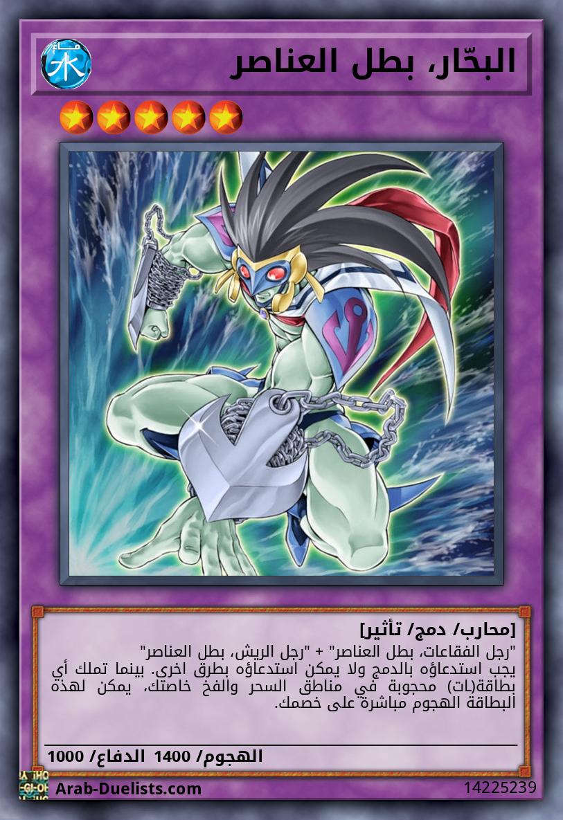 "المحيط، بطل العناصر" + "رجل الغابة، بطل العناصر" يجب استدعاؤه بالدمج ولا يمكن استدعاؤه بطرق أخرى. يمكنك التضحية بوحش 1 مكشوف "بطل العناصر"؛ تكسب هذه البطاقة نقاط هجوم مساوية لنقاط هجوم ذلك الوحش المضحى به، حتى مرحلة النهاية.