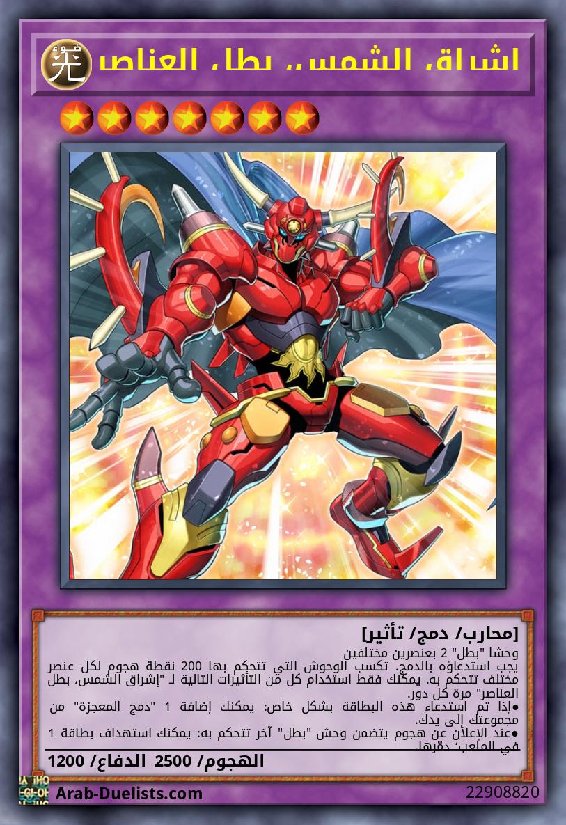 وحشا "بطل" 2 بعنصرين مختلفين يجب استدعاؤه بالدمج. تكسب الوحوش التي تتحكم بها 200 نقطة هجوم لكل عنصر مختلف تتحكم به. يمكنك فقط استخدام كل من التأثيرات التالية لـ "إشراق الشمس، بطل العناصر" مرة كل دور. ●إذا تم استدعاء هذه البطاقة بشكل خاص: يمكنك إضافة 1 "دمج المعجزة" من مجموعتك إلى يدك. ●عند الإعلان عن هجوم يتضمن وحش "بطل" آخر تتحكم به: يمكنك استهداف بطاقة 1 في الملعب؛ دمّرها.
