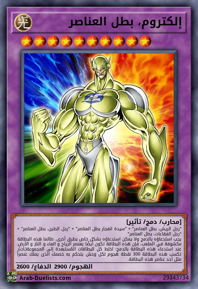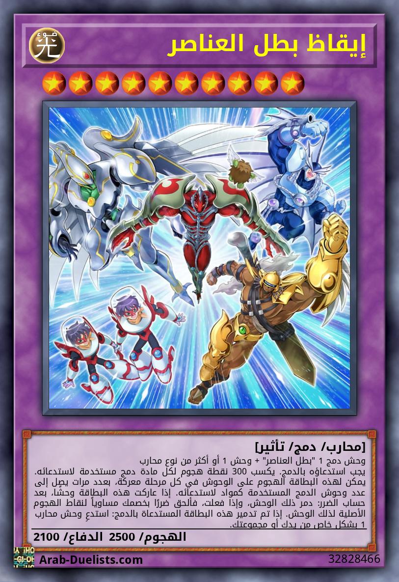وحش دمج 1 "بطل العناصر" + وحش 1 أو أكثر من نوع محارب يجب استدعاؤه بالدمج. يكسب 300 نقطة هجوم لكل مادة دمج مستخدمة لاستدعائه. يمكن لهذه البطاقة الهجوم على الوحوش في كل مرحلة معركة، بعدد مرات يصل إلى عدد وحوش الدمج المستخدمة كمواد لاستدعائه. إذا عاركت هذه البطاقة وحشًا، بعد حساب الضرر: دمر ذلك الوحش، وإذا فعلت، فألحق ضررًا بخصمك مساوياً لنقاط الهجوم الأصلية لذلك الوحش. إذا تم تدمير هذه البطاقة المستدعاة بالدمج: استدعِ وحش محارب 1 بشكل خاص من يدك أو مجموعتك.