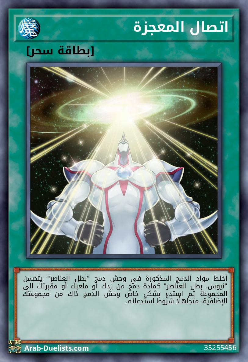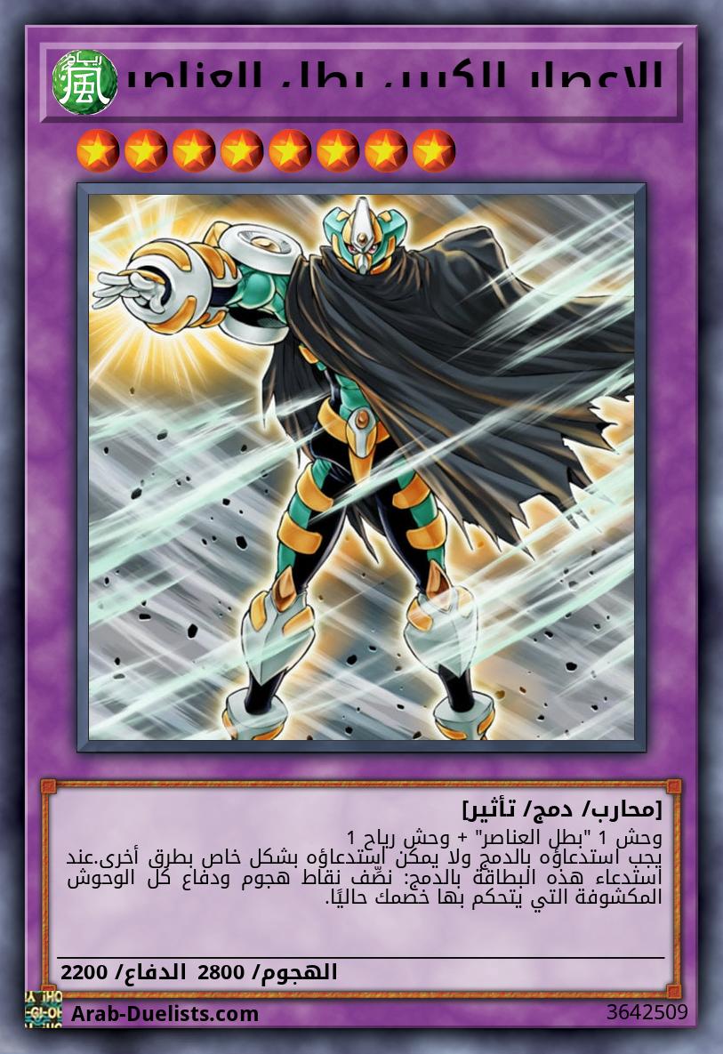 وحش 1 "بطل العناصر" + وحش رياح 1 يجب استدعاؤه بالدمج ولا يمكن استدعاؤه بشكل خاص بطرق أخرى.عند استدعاء هذه البطاقة بالدمج: نصِّف نقاط هجوم ودفاع كل الوحوش المكشوفة التي يتحكم بها خصمك حاليًا.