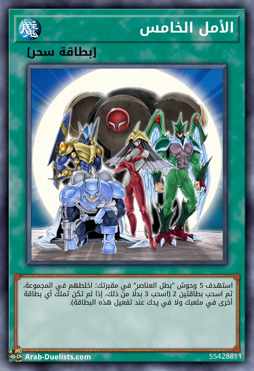 استهدف 5 وحوش "بطل العناصر" في مقبرتك؛ اخلطهم في المجموعة، ثم اسحب بطاقتين 2 (اسحب 3 بدلًا من ذلك، إذا لم تكن تملك أي بطاقة أخرى في ملعبك ولا في يدك عند تفعيل هذه البطاقة).