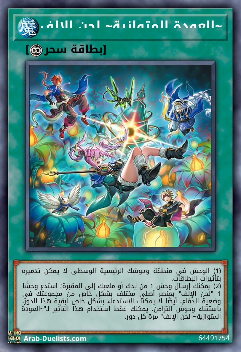 (1) الوحش في منطقة وحوشك الرئيسية الوسطى لا يمكن تدميره بتأثيرات البطاقات. (2) يمكنك إرسال وحش 1 من يدك أو ملعبك إلى المقبرة؛ استدع وحشًا 1 "لحن الإلف" بعنصر أصلي مختلف بشكل خاص من مجموعتك في وضعية الدفاع، أيضًا لا يمكنك الاستدعاء بشكل خاص لبقية هذا الدور، باستثناء وحوش التزامن. يمكنك فقط استخدام هذا التأثير لـ"~العودة المتوازية~ لحن الإلف" مرة كل دور.