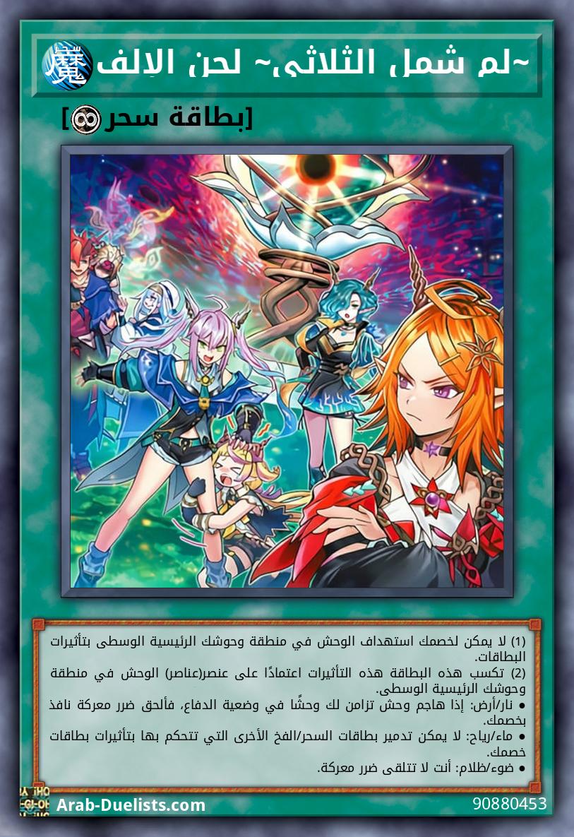 (1) لا يمكن لخصمك استهداف الوحش في منطقة وحوشك الرئيسية الوسطى بتأثيرات البطاقات. (2) تكسب هذه البطاقة هذه التأثيرات اعتمادًا على عنصر(عناصر) الوحش في منطقة وحوشك الرئيسية الوسطى. ● نار/أرض: إذا هاجم وحش تزامن لك وحشًا في وضعية الدفاع، فألحق ضرر معركة نافذ بخصمك. ● ماء/رياح: لا يمكن تدمير بطاقات السحر/الفخ الأخرى التي تتحكم بها بتأثيرات بطاقات خصمك. ● ضوء/ظلام: أنت لا تتلقى ضرر معركة.