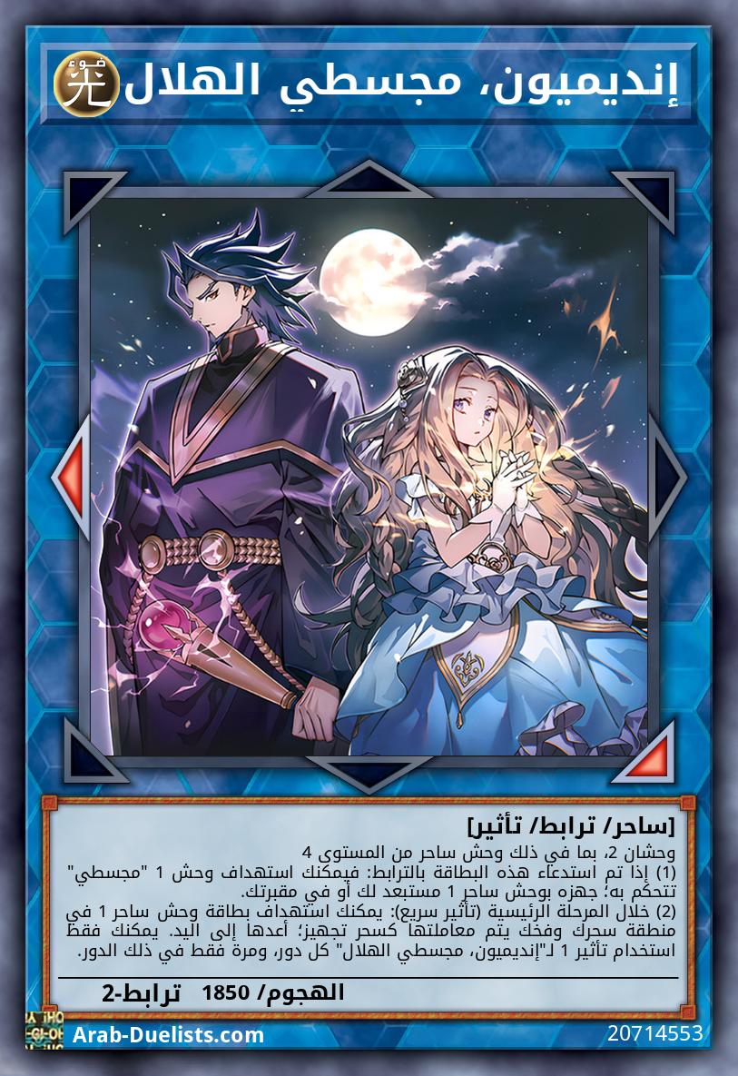 وحشان 2، بما في ذلك وحش ساحر من المستوى 4 (1) إذا تم استدعاء هذه البطاقة بالترابط: فيمكنك استهداف وحش 1 "مجسطي" تتحكم به؛ جهزه بوحش ساحر 1 مستبعد لك أو في مقبرتك. (2) خلال المرحلة الرئيسية (تأثير سريع): يمكنك استهداف بطاقة وحش ساحر 1 في منطقة سحرك وفخك يتم معاملتها كسحر تجهيز؛ أعدها إلى اليد. يمكنك فقط استخدام تأثير 1 لـ"إنديميون، مجسطي الهلال" كل دور، ومرة فقط في ذلك الدور.