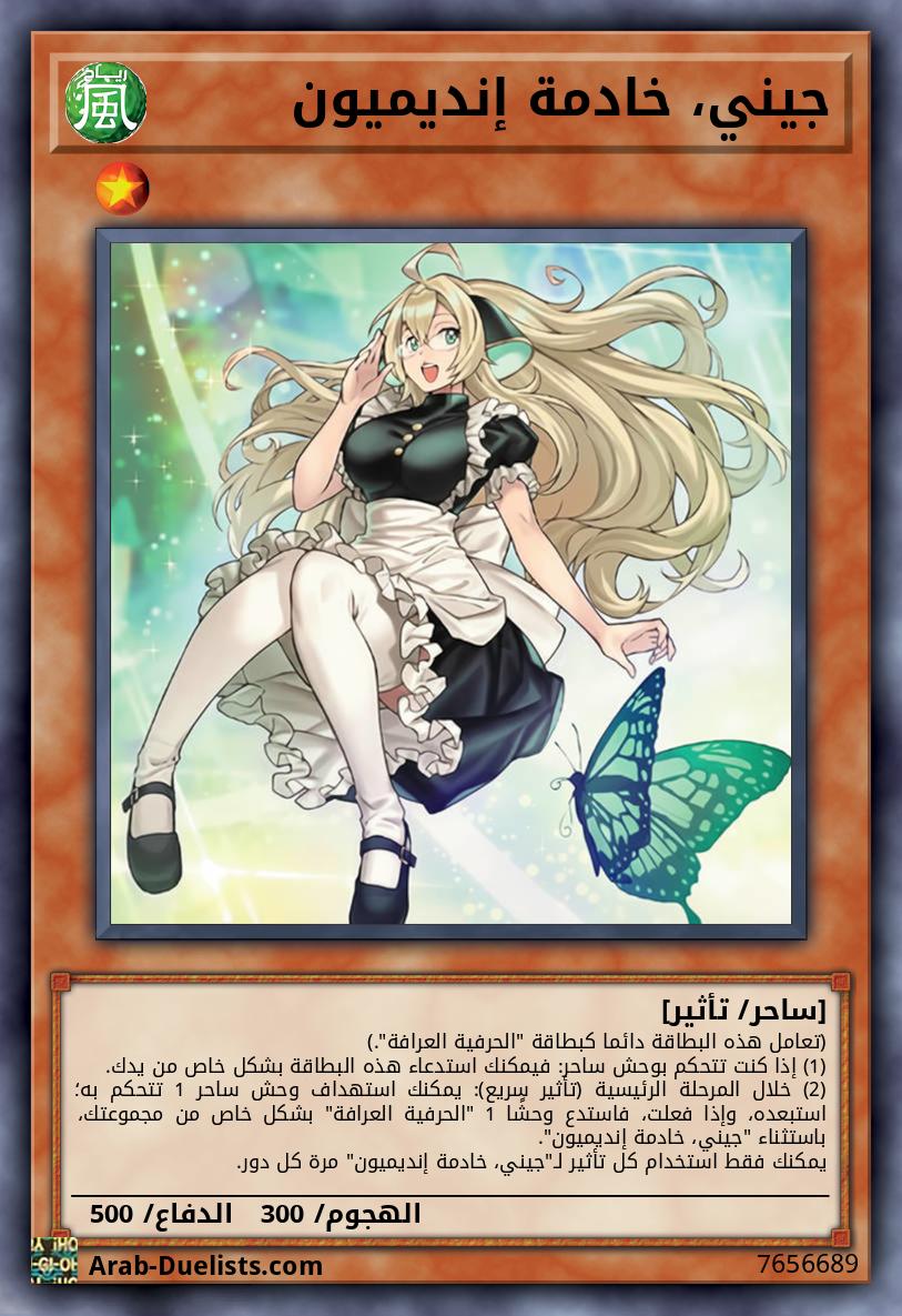 (تعامل هذه البطاقة دائما كبطاقة "الحرفية العرافة".) (1) إذا كنت تتحكم بوحش ساحر: فيمكنك استدعاء هذه البطاقة بشكل خاص من يدك. (2) خلال المرحلة الرئيسية (تأثير سريع): يمكنك استهداف وحش ساحر 1 تتحكم به؛ استبعده، وإذا فعلت، فاستدع وحشًا 1 "الحرفية العرافة" بشكل خاص من مجموعتك، باستثناء "جيني، خادمة إنديميون". يمكنك فقط استخدام كل تأثير لـ"جيني، خادمة إنديميون" مرة كل دور.