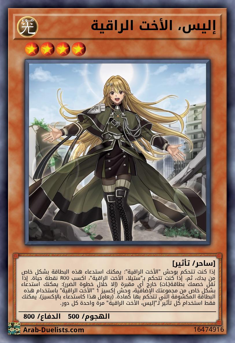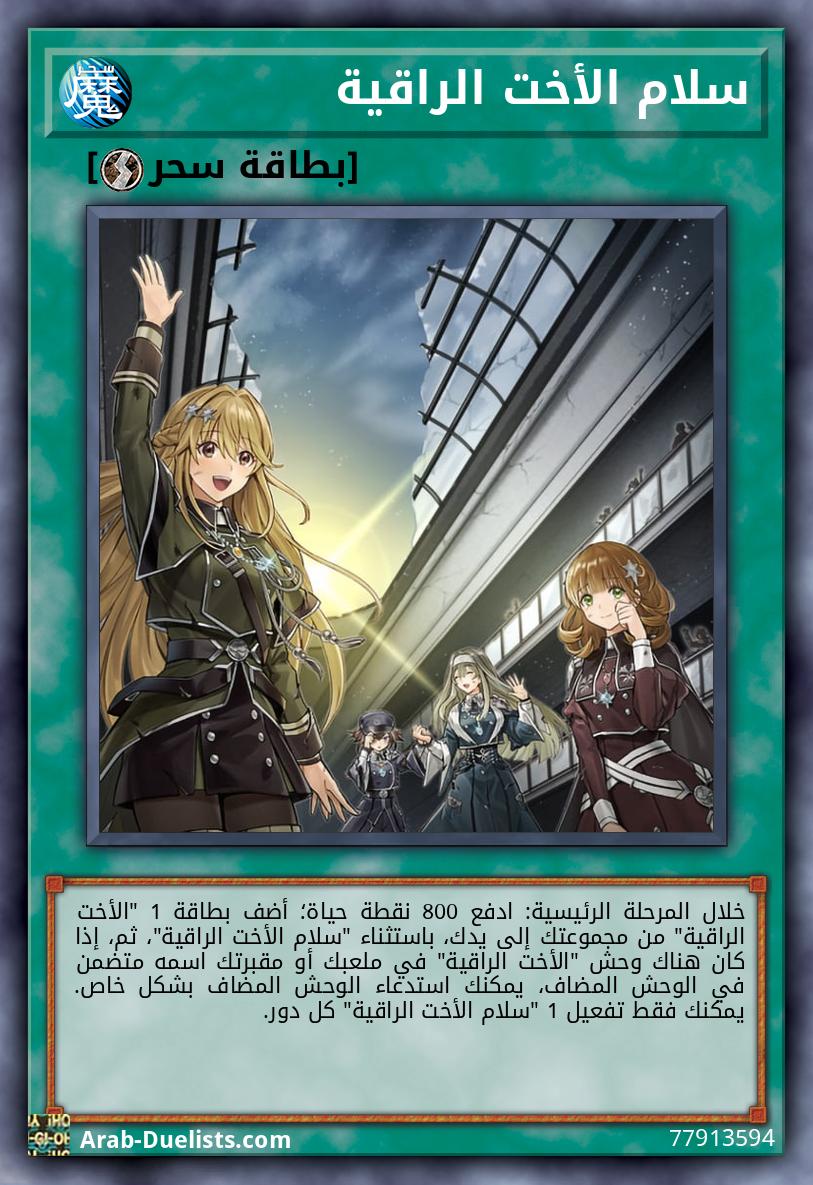 لا يمكن لأي لاعب استهداف وحوش "الأخت الراقية" التي تتحكم بها بتأثيرات الوحوش المستدعاة بشكل خاص من المقبرة. يمكنك فقط استخدام كل من التأثيرات التالية لـ" انتهاز فرصة الأخت الراقية" مرة واحدة كل دور. إذا اِستَدعَيتَ وحش "الأخت الراقية" بالإكسيز: يمكنك إعلان اسم بطاقة 1؛ لبقية هذا الدور، ألغ التأثيرات المفعلة والتأثيرات في الملعب من البطاقات بنفس ذلك الاسم الأصلي (حتى إذا غادرت هذه البطاقة الملعب). عندما يعلن عن هجوم يتضمن وحش "الأخت الراقية": يمكنك استهداف سحر/فخ 1 يتحكم به خصمك؛ دمّره.