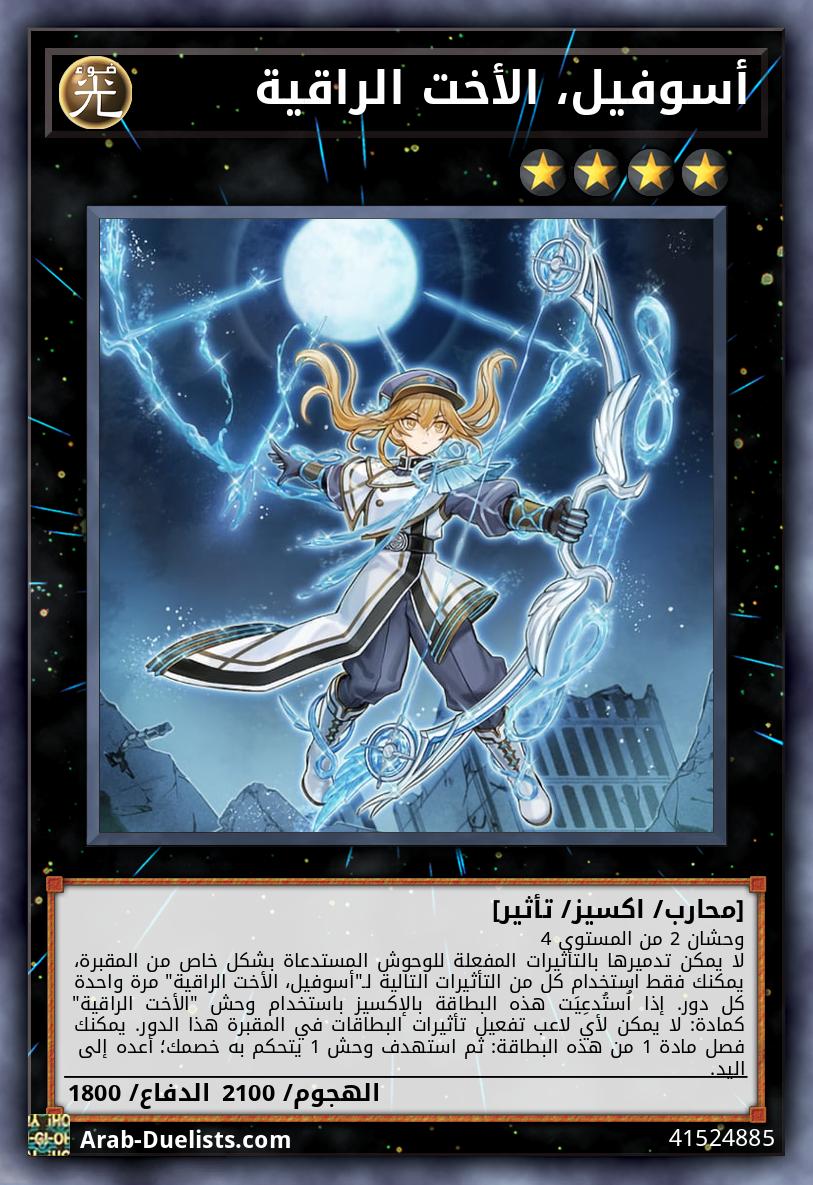 وحشان 2 من المستوى 4 لا يمكن تدميرها بالتأثيرات المفعلة للوحوش المستدعاة بشكل خاص من المقبرة، يمكنك فقط استخدام كل من التأثيرات التالية لـ"أسوفيل، الأخت الراقية" مرة واحدة كل دور. إذا اُستُدعِيَت هذه البطاقة بالإكسيز باستخدام وحش "الأخت الراقية" كمادة: لا يمكن لأي لاعب تفعيل تأثيرات البطاقات في المقبرة هذا الدور. يمكنك فصل مادة 1 من هذه البطاقة: ثم استهدف وحش 1 يتحكم به خصمك؛ أعده إلى اليد.