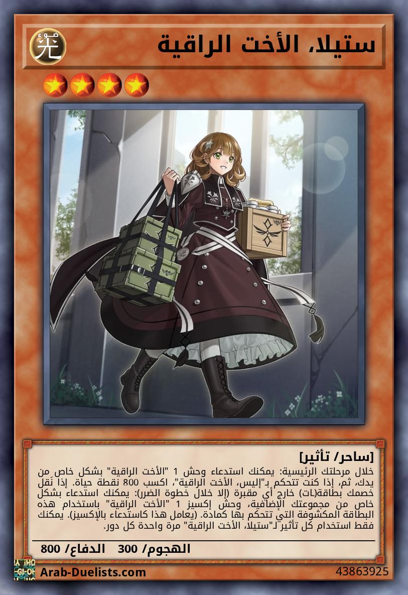 خلال مرحلتك الرئيسية: يمكنك استدعاء وحش 1 "الأخت الراقية" بشكل خاص من يدك، ثم، إذا كنت تتحكم بـ"إليس، الأخت الراقية"، اكسب 800 نقطة حياة. إذا نَقل خصمك بطاقة(ـات) خارج أي مقبرة (إلا خلال خطوة الضرر): يمكنك استدعاء بشكل خاص من مجموعتك الإضافية، وحش إكسيز 1 "الأخت الراقية" باستخدام هذه البطاقة المكشوفة التي تتحكم بها كمادة. (يعامل هذا كاستدعاء بالإكسيز). يمكنك فقط استخدام كل تأثير لـ"ستيلا، الأخت الراقية" مرة واحدة كل دور.