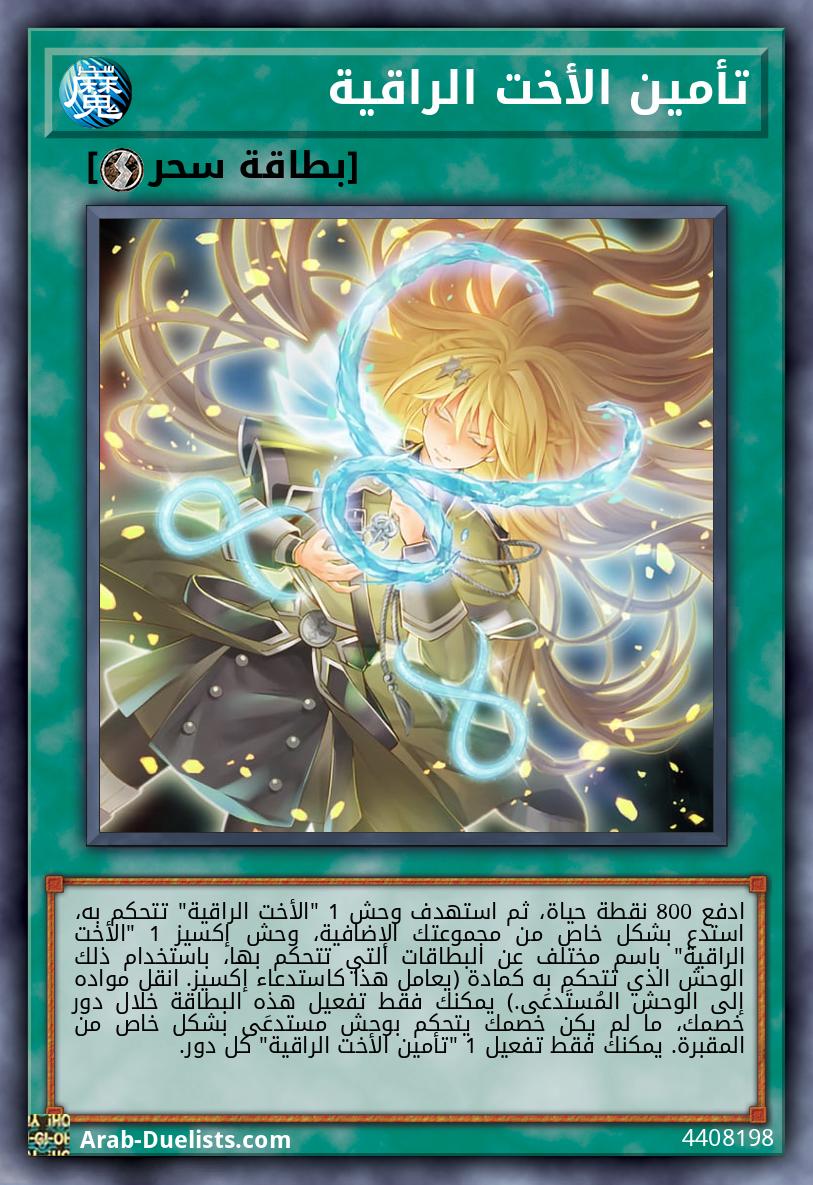 ادفع 800 نقطة حياة، ثم استهدف وحش 1 "الأخت الراقية" تتحكم به، استدع بشكل خاص من مجموعتك الإضافية، وحش إكسيز 1 "الأخت الراقية" باسم مختلف عن البطاقات التي تتحكم بها، باستخدام ذلك الوحش الذي تتحكم به كمادة (يعامل هذا كاستدعاء إكسيز. انقل مواده إلى الوحش المُستَدعَى.) يمكنك فقط تفعيل هذه البطاقة خلال دور خصمك، ما لم يكن خصمك يتحكم بوحش مستدعَى بشكل خاص من المقبرة. يمكنك فقط تفعيل 1 "تأمين الأخت الراقية" كل دور.