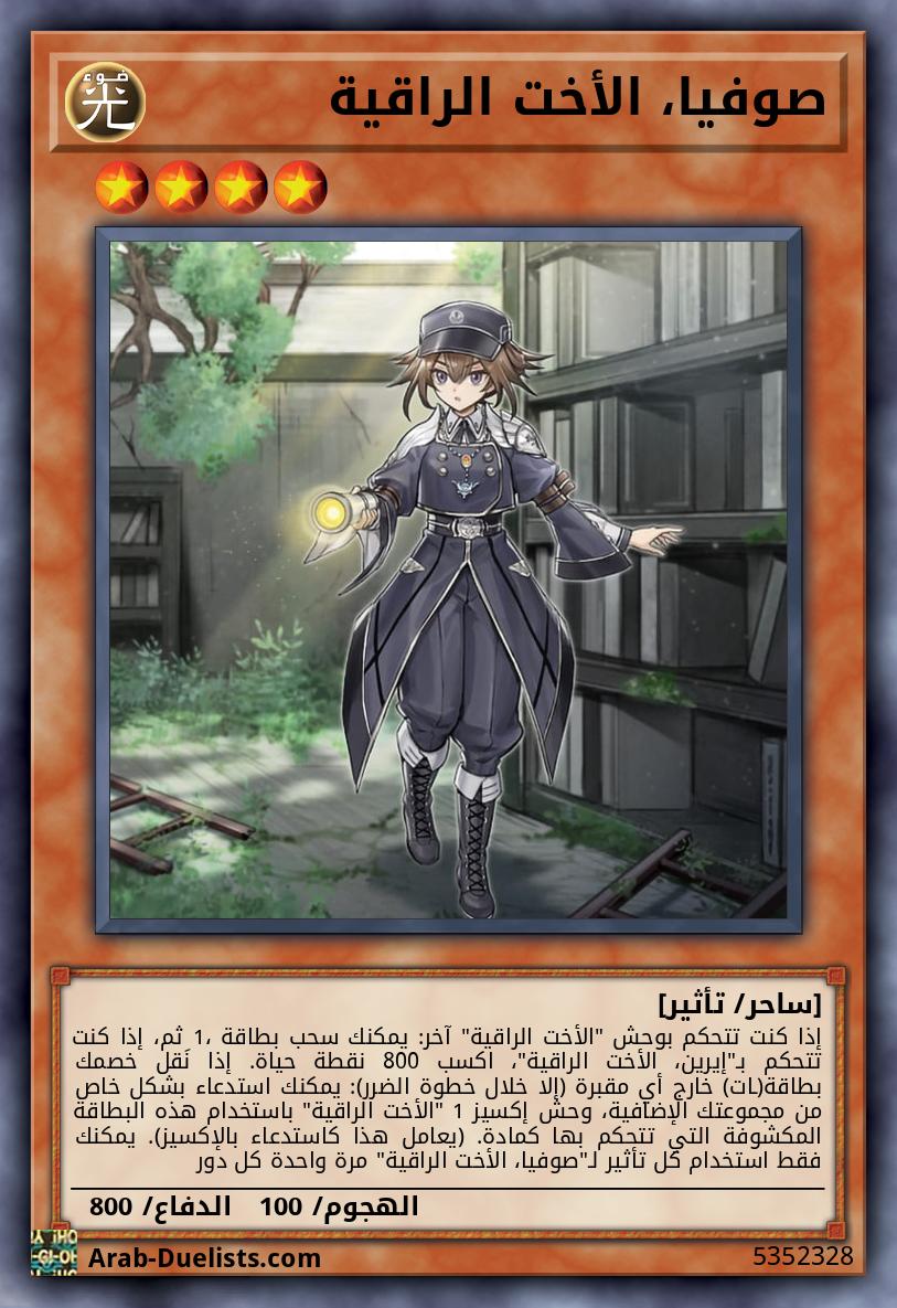 إذا كنت تتحكم بوحش "الأخت الراقية" آخر: يمكنك سحب بطاقة 1، ثم، إذا كنت تتحكم بـ"إيرين، الأخت الراقية"، اكسب 800 نقطة حياة. إذا نَقل خصمك بطاقة(ـات) خارج أي مقبرة (إلا خلال خطوة الضرر): يمكنك استدعاء بشكل خاص من مجموعتك الإضافية، وحش إكسيز 1 "الأخت الراقية" باستخدام هذه البطاقة المكشوفة التي تتحكم بها كمادة. (يعامل هذا كاستدعاء بالإكسيز). يمكنك فقط استخدام كل تأثير لـ"صوفيا، الأخت الراقية" مرة واحدة كل دور