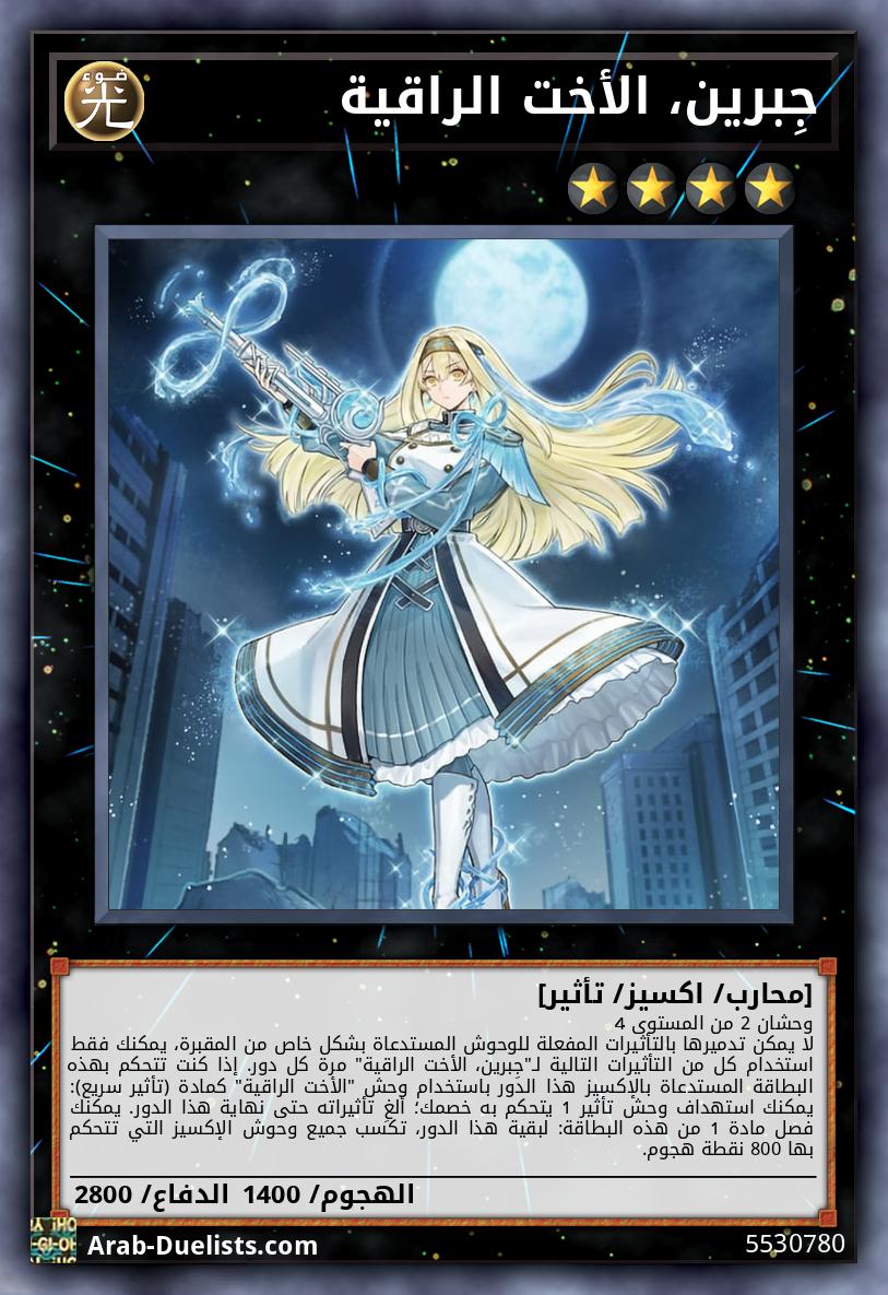 وحشان 2 من المستوى 4 لا يمكن تدميرها بالتأثيرات المفعلة للوحوش المستدعاة بشكل خاص من المقبرة، يمكنك فقط استخدام كل من التأثيرات التالية لـ"جِبرين، الأخت الراقية" مرة كل دور. إذا كنت تتحكم بهذه البطاقة المستدعاة بالإكسيز هذا الدور باستخدام وحش "الأخت الراقية" كمادة (تأثير سريع): يمكنك استهداف وحش تأثير 1 يتحكم به خصمك؛ ألغِ تأثيراته حتى نهاية هذا الدور. يمكنك فصل مادة 1 من هذه البطاقة: لبقية هذا الدور، تكسب جميع وحوش الإكسيز التي تتحكم بها 800 نقطة هجوم.