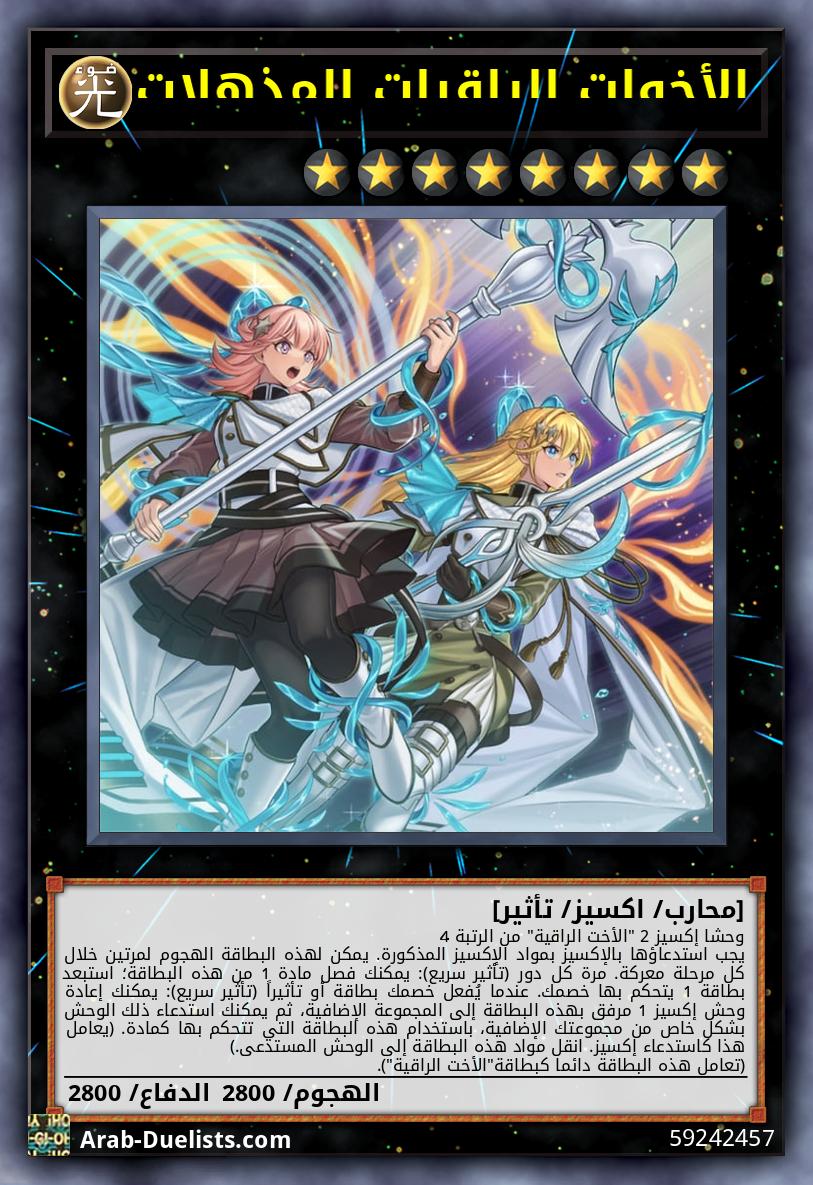 وحشا إكسيز 2 "الأخت الراقية" من الرتبة 4 يجب استدعاؤها بالإكسيز بمواد الإكسيز المذكورة. يمكن لهذه البطاقة الهجوم لمرتين خلال كل مرحلة معركة. مرة كل دور (تأثير سريع): يمكنك فصل مادة 1 من هذه البطاقة؛ استبعد بطاقة 1 يتحكم بها خصمك. عندما يُفعل خصمك بطاقة أو تأثيراً (تأثير سريع): يمكنك إعادة وحش إكسيز 1 مرفق بهذه البطاقة إلى المجموعة الإضافية، ثم يمكنك استدعاء ذلك الوحش بشكل خاص من مجموعتك الإضافية، باستخدام هذه البطاقة التي تتحكم بها كمادة. (يعامل هذا كاستدعاء إكسيز. انقل مواد هذه البطاقة إلى الوحش المستدعى.) (تعامل هذه البطاقة دائما كبطاقة"الأخت الراقية").