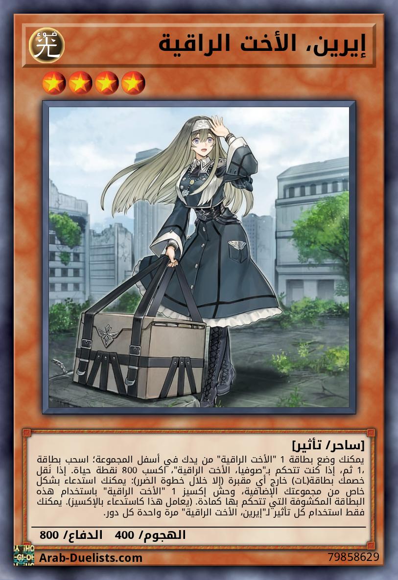 يمكنك وضع بطاقة 1 "الأخت الراقية" من يدك في أسفل المجموعة؛ اسحب بطاقة 1، ثم، إذا كنت تتحكم بـ"صوفيا، الأخت الراقية"، اكسب 800 نقطة حياة. إذا نَقل خصمك بطاقة(ـات) خارج أي مقبرة (إلا خلال خطوة الضرر): يمكنك استدعاء بشكل خاص من مجموعتك الإضافية، وحش إكسيز 1 "الأخت الراقية" باستخدام هذه البطاقة المكشوفة التي تتحكم بها كمادة. (يعامل هذا كاستدعاء بالإكسيز). يمكنك فقط استخدام كل تأثير لـ"إيرين، الأخت الراقية" مرة واحدة كل دور.