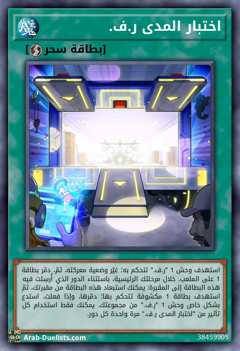استهدف وحش 1 "ر.ف." تتحكم به؛ غيّر وضعية معركته، ثمّ، دمّر بطاقة 1 على الملعب. خلال مرحلتك الرئيسية، باستثناء الدور الذي أُرسِلت فيه هذه البطاقة إلى المقبرة: يمكنك استبعاد هذه البطاقة من مقبرتك، ثمّ استهدف بطاقة 1 مكشوفة تتحكم بها؛ دمّرها، وإذا فعلت، استدع بشكل خاص وحش 1 "ر.ف." من مجموعتك. يمكنك فقط استخدام كل تأثير من "اختبار المدى ر.ف." مرة واحدة كل دور.