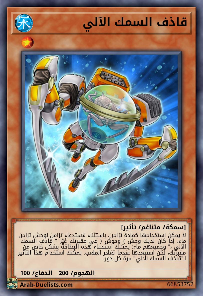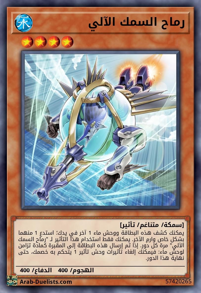 يمكنك كشف هذه البطاقة ووحش ماء 1 آخر في يدك؛ استدعِ 1 منهما بشكل خاص وارمِ الآخر. يمكنك فقط استخدام هذا التأثير لـ "رماح السمك الآلي" مرة كل دور. إذا تم إرسال هذه البطاقة إلى المقبرة كمادة تزامن لوحش ماء: فيمكنك إلغاء تأثيرات وحش تأثير 1 يتحكم به خصمك، حتى نهاية هذا الدور.
