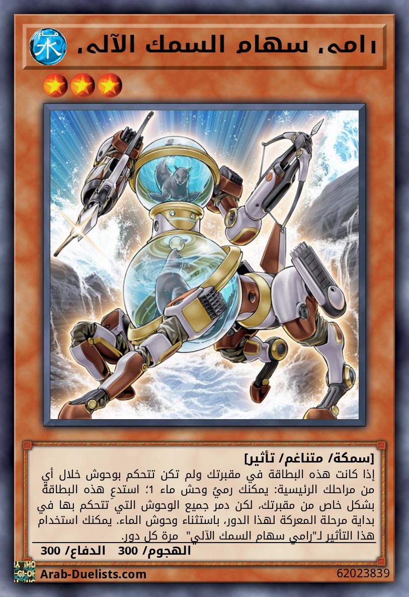 إذا كانت هذه البطاقة في مقبرتك ولم تكن تتحكم بوحوش خلال أيٍ من مراحلك الرئيسية: يمكنك رميُ وحش ماء 1؛ استدعِ هذه البطاقة بشكل خاص من مقبرتك، لكن دمر جميع الوحوش التي تتحكم بها في بداية مرحلة المعركة لهذا الدور، باستثناء وحوش الماء. يمكنك استخدام هذا التأثير لـ"رامي سهام السمك الآلي" مرة كل دور.