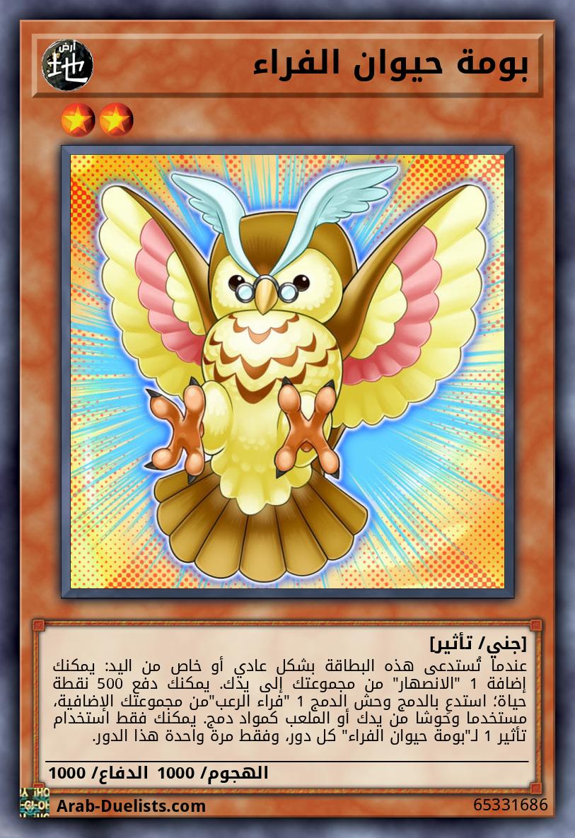 عندما تُستدعى هذه البطاقة بشكل عادي أو خاص من اليد: يمكنك إضافة 1 "الانصهار" من مجموعتك إلى يدك. يمكنك دفع 500 نقطة حياة؛ استدعِ بالدمج وحش الدمج 1 "فراء الرعب"من مجموعتك الإضافية، مستخدما وحوشا من يدك أو الملعب كمواد دمج. يمكنك فقط استخدام تأثير 1 لـ"بومة حيوان الفراء" كل دور، وفقط مرة واحدة هذا الدور.