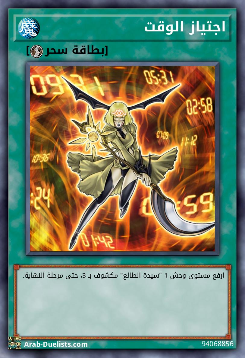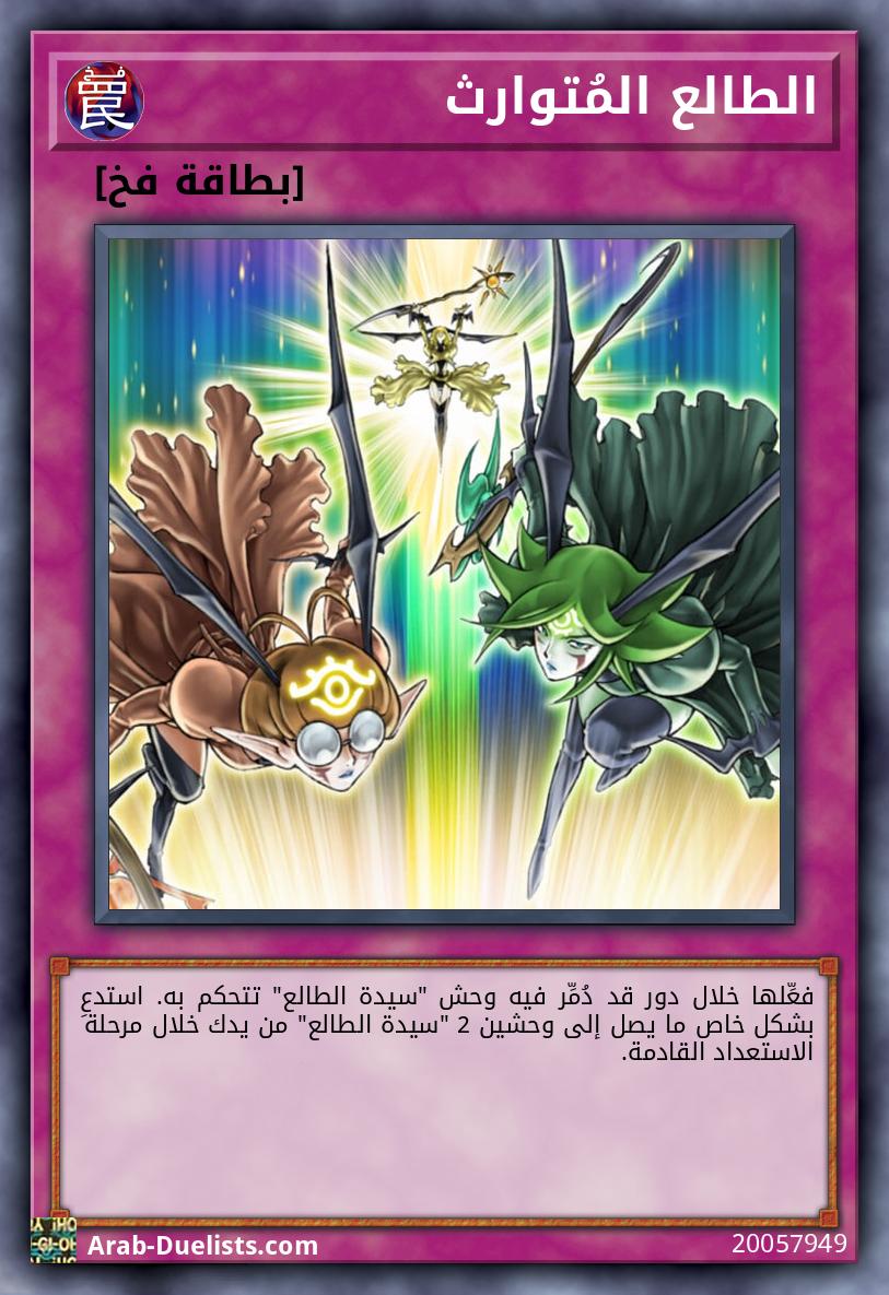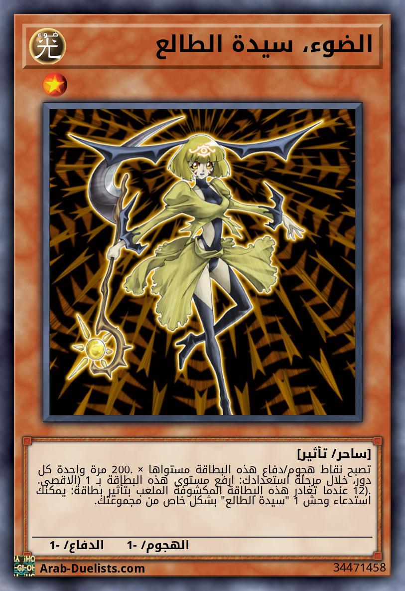 تصبح نقاط هجوم ودفاع هذه البطاقة مستواها × 400. خلال كل مرحلة استعداد لك، ارفع مستوى هذه البطاقة بـ 1 (12 كحد أقصى). عندما يدمّر وحش "سيدة الطالع" وحشاً للخصم في المعركة ويرسله للمقبرة، يمكنك استهداف وحش 1 "سيدة الطالع" في مقبرتك؛ استدعه بشكل خاص.