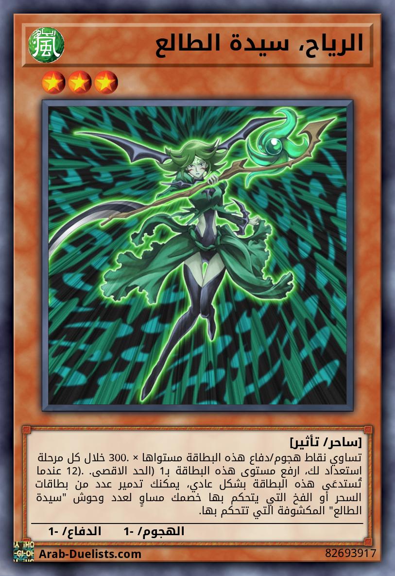 تساوي نقاط هجوم/دفاع هذه البطاقة مستواها × 300. خلال كل مرحلة استعداد لك، ارفع مستوى هذه البطاقة بـ1 (الحد الاقصى. 12). عندما تُستدعَى هذه البطاقة بشكل عادي، يمكنك تدمير عدد من بطاقات السحر أو الفخ التي يتحكم بها خصمك مساوٍ لعدد وحوش "سيدة الطالع" المكشوفة التي تتحكم بها.
