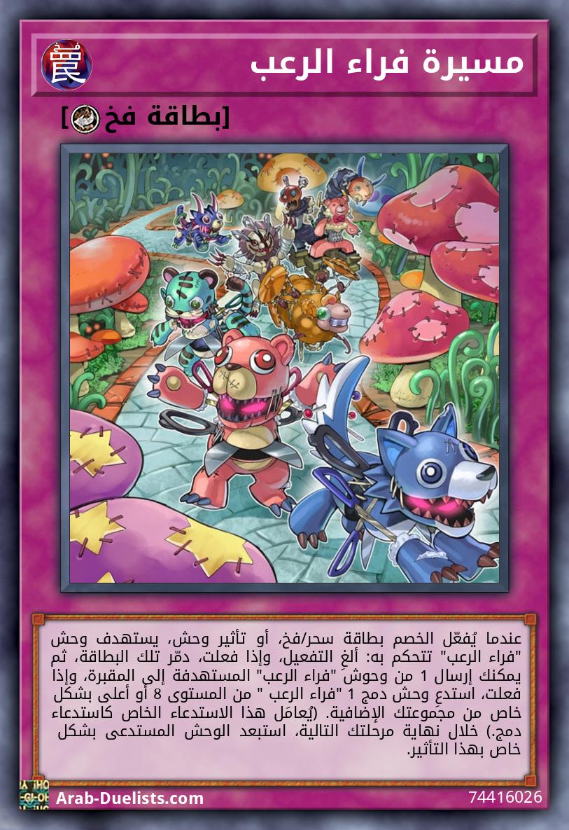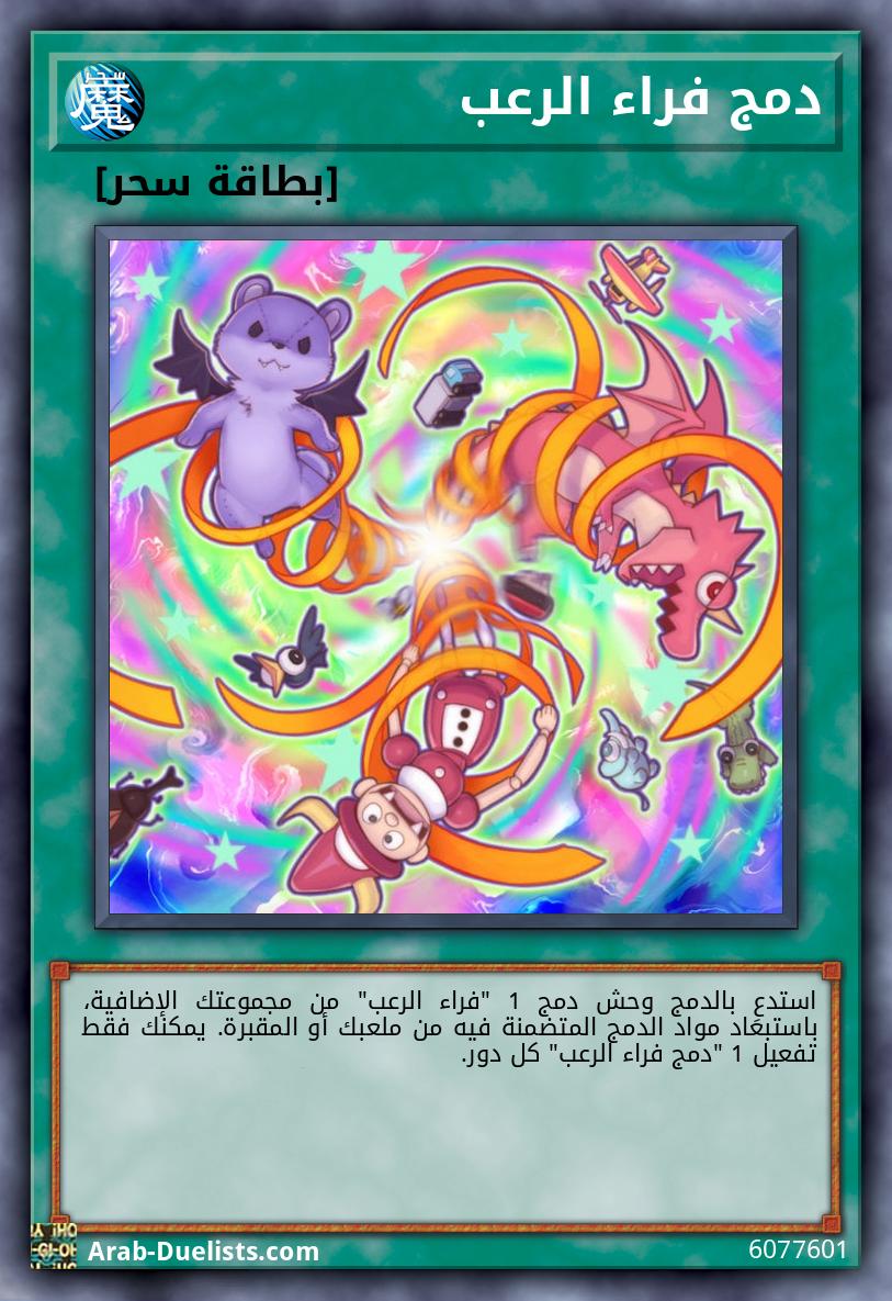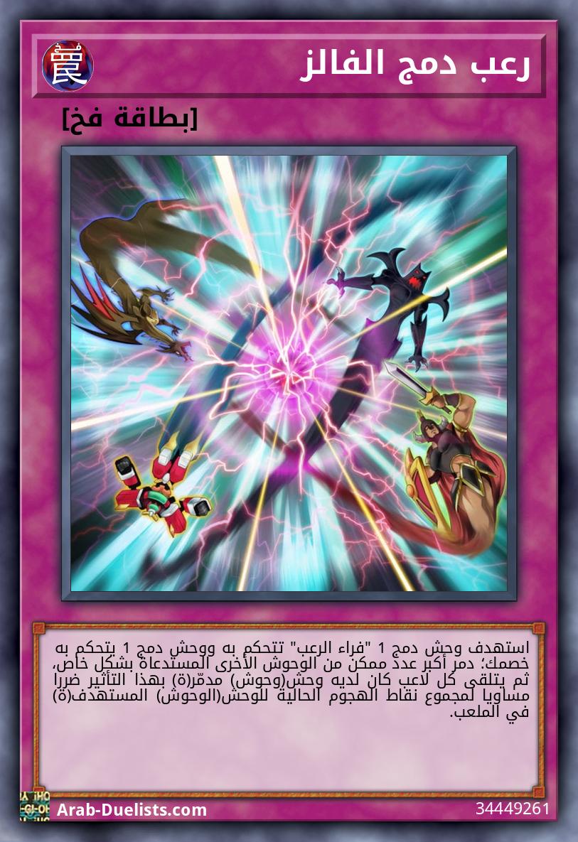 استهدف وحش دمج 1 "فراء الرعب" تتحكم به ووحش دمج 1 يتحكم به خصمك؛ دمر أكبر عدد ممكن من الوحوش الأخرى المستدعاة بشكل خاص، ثم يتلقى كل لاعب كان لديه وحش(وحوش) مدمّر(ة) بهذا التأثير ضررا مساويا لمجموع نقاط الهجوم الحالية للوحش(الوحوش) المستهدف(ة) في الملعب.