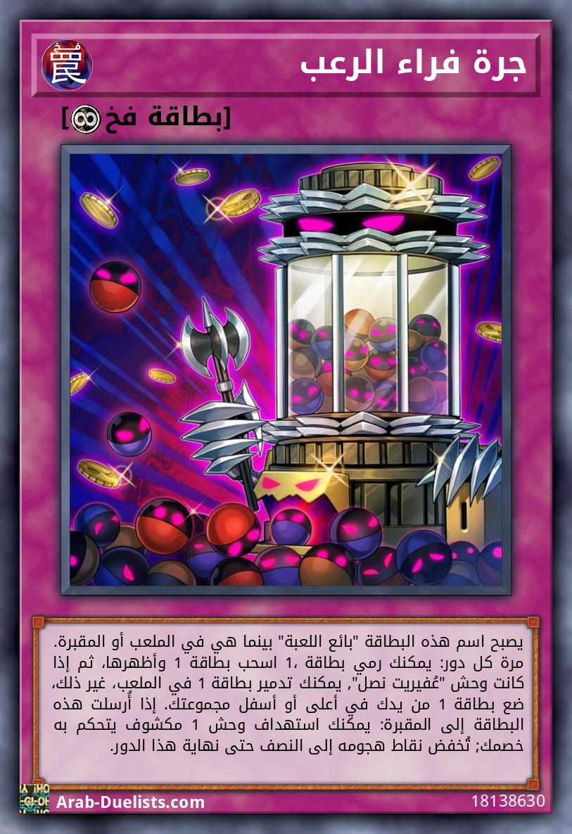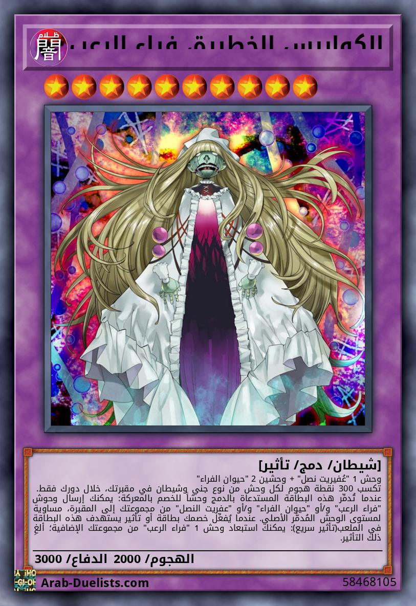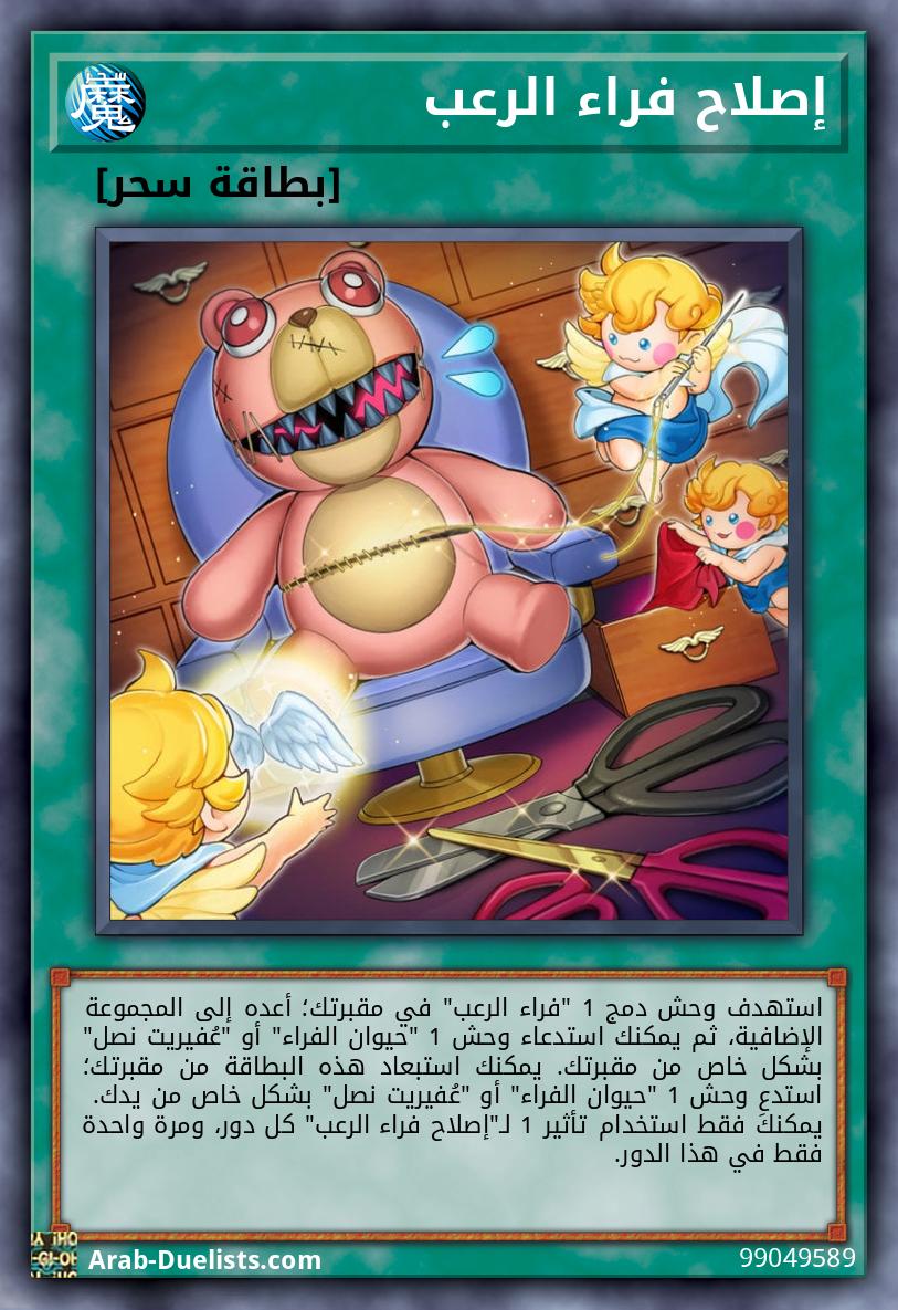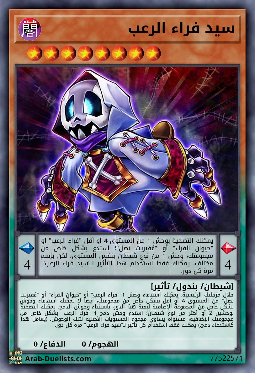 استهدف وحش دمج 1 "فراء الرعب" تتحكم به ووحش دمج 1 يتحكم به خصمك؛ دمر أكبر عدد ممكن من الوحوش الأخرى المستدعاة بشكل خاص، ثم يتلقى كل لاعب كان لديه وحش(وحوش) مدمّر(ة) بهذا التأثير ضررا مساويا لمجموع نقاط الهجوم الحالية للوحش(الوحوش) المستهدف(ة) في الملعب.