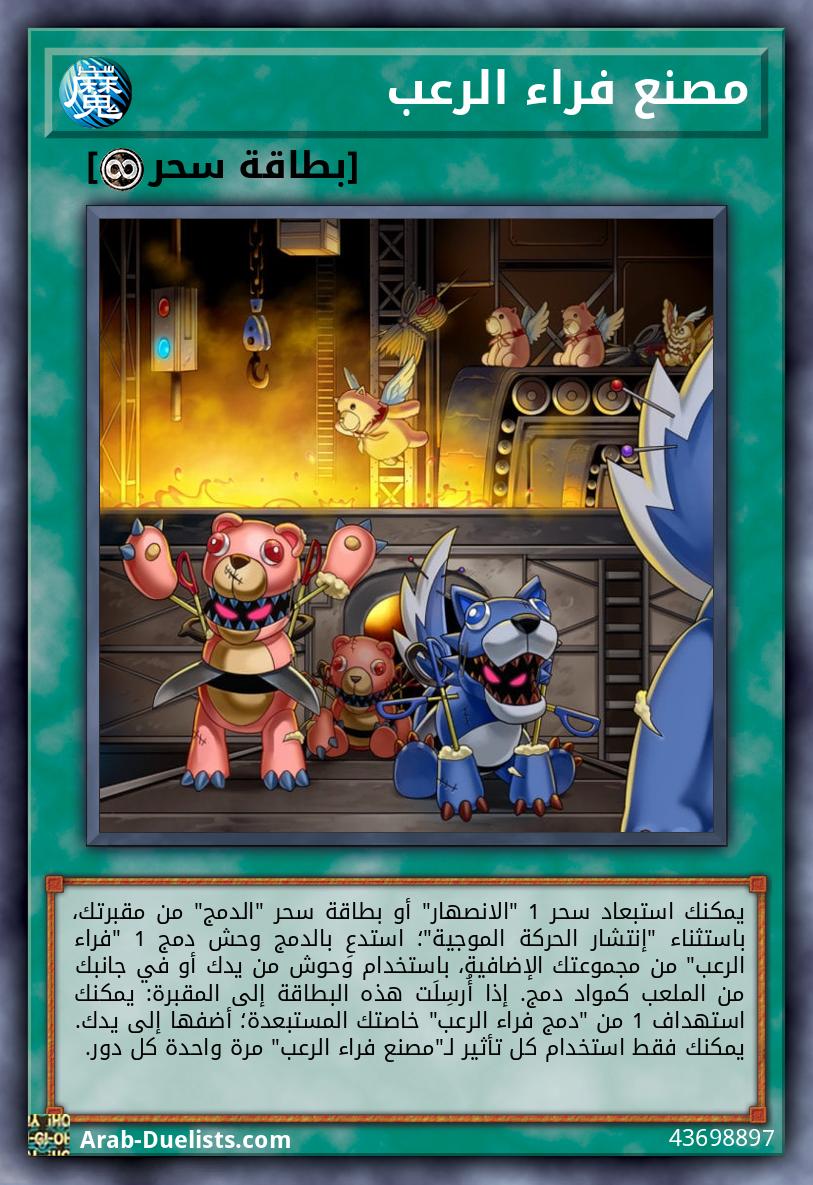 يمكنك استبعاد سحر 1 "الانصهار" أو بطاقة سحر "الدمج" من مقبرتك، باستثناء "إنتشار الحركة الموجية"؛ استدعِ بالدمج وحش دمج 1 "فراء الرعب" من مجموعتك الإضافية، باستخدام وحوش من يدك أو في جانبك من الملعب كمواد دمج. إذا أُرسِلَت هذه البطاقة إلى المقبرة: يمكنك استهداف 1 من "دمج فراء الرعب" خاصتك المستبعدة؛ أضفها إلى يدك. يمكنك فقط استخدام كل تأثير لـ"مصنع فراء الرعب" مرة واحدة كل دور.
