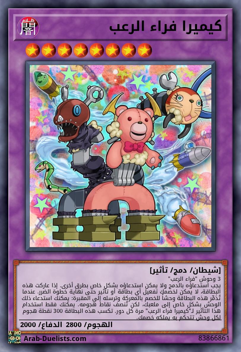 3 وحوش "فراء الرعب" يجب استدعاؤه بالدمج ولا يمكن استدعاؤه بشكل خاص بطرق أخرى. إذا عاركت هذه البطاقة، لا يمكن لخصمك تفعيل أي بطاقة أو تأثير حتى نهاية خطوة الضرر. عندما تُدَمِّر هذه البطاقة وحشاً للخصم بالمعركة وترسله إلى المقبرة: يمكنك استدعاء ذلك الوحش بشكل خاص إلى ملعبك، لكن تُنصف نقاط هجومه. يمكنك فقط استخدام هذا التأثير لـ"كيميرا فراء الرعب" مرة كل دور. تكسب هذه البطاقة 300 نقطة هجوم لكل وحش تتحكم به يملكه خصمك.