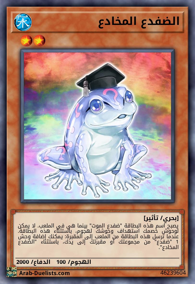 يصبح اسم هذه البطاقة "ضفدع الموت" بينما هي في الملعب. لا يمكن لوحوش خصمك استهداف وحوشك لهجوم، باستثناء هذه البطاقة. عندما ترسل هذه البطاقة من الملعب إلى المقبرة: يمكنك إضافة وحش 1 "ضفدع" من مجموعتك أو مقبرتك إلى يدك، باستثناء "الضفدع المخادع".