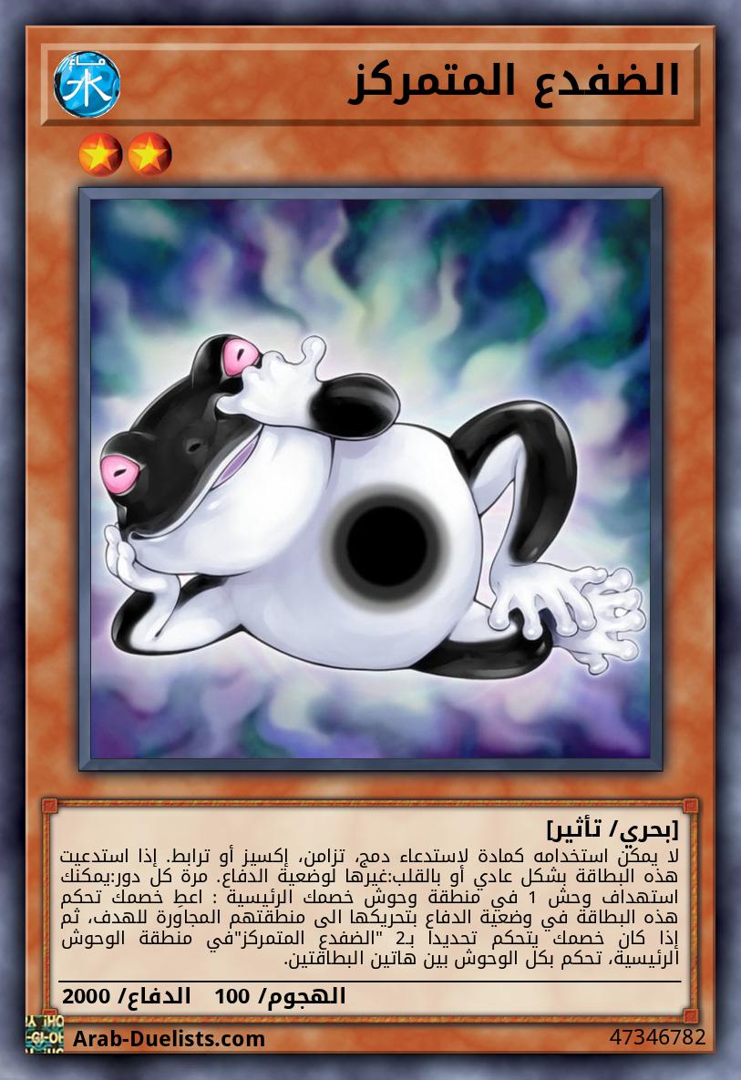 لا يمكن استخدامه كمادة لاستدعاء دمج، تزامن، إكسيز أو ترابط. إذا استدعيت هذه البطاقة بشكل عادي أو بالقلب:غيرها لوضعية الدفاع. مرة كل دور:يمكنك استهداف وحش 1 في منطقة وحوش خصمك الرئيسية : اعطِ خصمك تحكم هذه البطاقة في وضعية الدفاع بتحريكها الى منطقتهم المجاورة للهدف، ثم إذا كان خصمك يتحكم تحديدا بـ2 "الضفدع المتمركز"في منطقة الوحوش الرئيسية، تحكم بكل الوحوش بين هاتين البطاقتين.