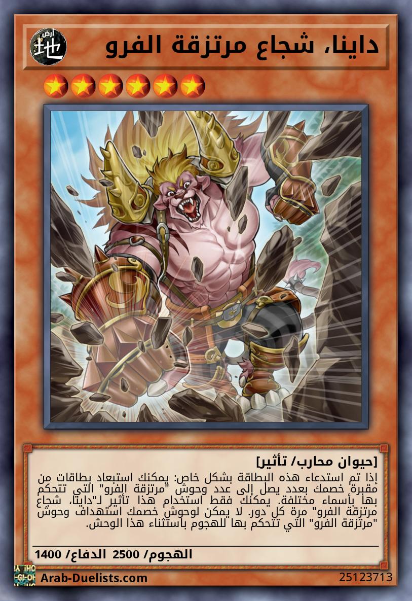 إذا تم استدعاء هذه البطاقة بشكل خاص: يمكنك استبعاد بطاقات من مقبرة خصمك بعدد يصل إلى عدد وحوش "مرتزقة الفرو" التي تتحكم بها بأسماء مختلفة. يمكنك فقط استخدام هذا تأثير لـ"داينا، شجاع مرتزقة الفرو" مرة كل دور. لا يمكن لوحوش خصمك استهداف وحوش "مرتزقة الفرو" التي تتحكم بها للهجوم باستثناء هذا الوحش.