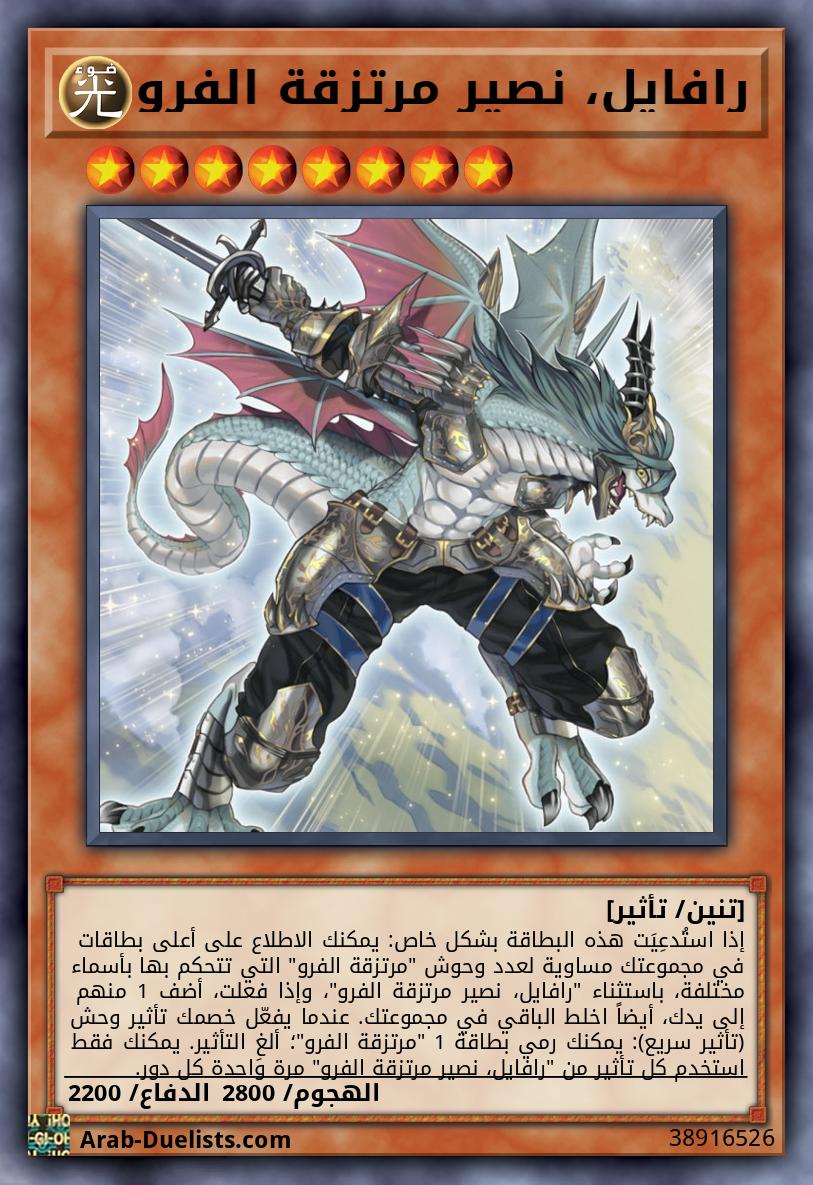 إذا استُدعِيَت هذه البطاقة بشكل خاص: يمكنك الاطلاع على أعلى بطاقات في مجموعتك مساوية لعدد وحوش "مرتزقة الفرو" التي تتحكم بها بأسماء مختلفة، باستثناء "رافايل، نصير مرتزقة الفرو"، وإذا فعلت، أضف 1 منهم إلى يدك، أيضاً اخلط الباقي في مجموعتك. عندما يفعّل خصمك تأثير وحش (تأثير سريع): يمكنك رمي بطاقة 1 "مرتزقة الفرو"؛ ألغِ التأثير. يمكنك فقط استخدم كل تأثير من "رافايل، نصير مرتزقة الفرو" مرة واحدة كل دور.