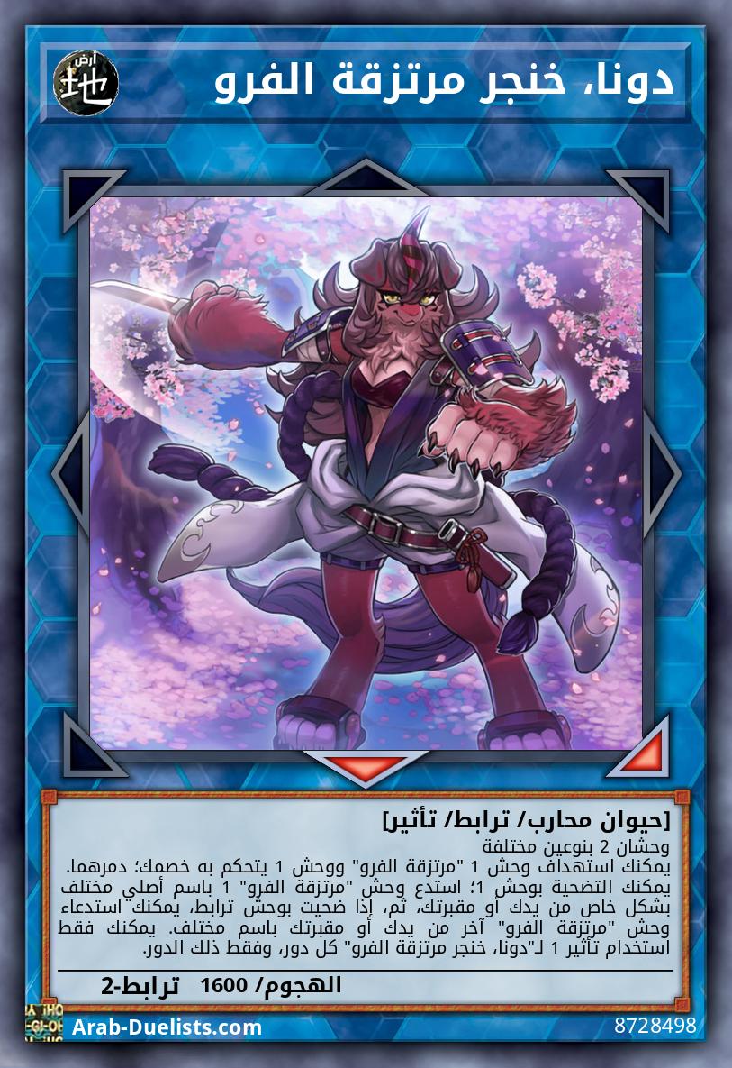وحشان 2 بنوعين مختلفة يمكنك استهداف وحش 1 "مرتزقة الفرو" ووحش 1 يتحكم به خصمك؛ دمرهما. يمكنك التضحية بوحش 1؛ استدع وحش "مرتزقة الفرو" 1 باسم أصلي مختلف بشكل خاص من يدك أو مقبرتك، ثم، إذا ضحيت بوحش ترابط، يمكنك استدعاء وحش "مرتزقة الفرو" آخر من يدك أو مقبرتك باسم مختلف. يمكنك فقط استخدام تأثير 1 لـ"دونا، خنجر مرتزقة الفرو" كل دور، وفقط ذلك الدور.