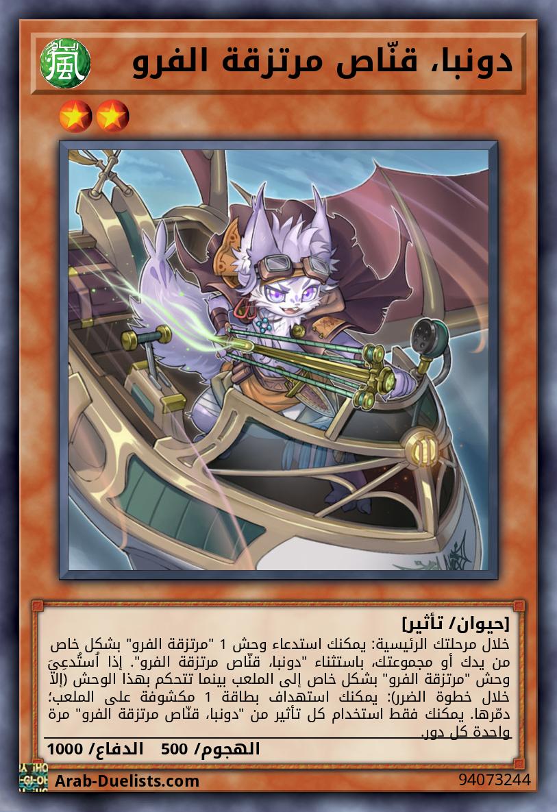 خلال مرحلتك الرئيسية: يمكنك استدعاء وحش 1 "مرتزقة الفرو" بشكل خاص من يدك أو مجموعتك، باستثناء "دونبا، قنّاص مرتزقة الفرو". إذا اُستُدعِيَ وحش "مرتزقة الفرو" بشكل خاص إلى الملعب بينما تتحكم بهذا الوحش (إلا خلال خطوة الضرر): يمكنك استهداف بطاقة 1 مكشوفة على الملعب؛ دمّرها. يمكنك فقط استخدام كل تأثير من "دونبا، قنّاص مرتزقة الفرو" مرة واحدة كل دور.