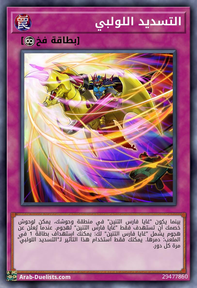 بينما يكون "غايا فارس التنين" في منطقة وحوشك، يمكن لوحوش خصمك أن تستهدف فقط "غايا فارس التنين" لهجوم. عندما يُعلَن عن هجوم يشمل "غايا فارس التنين" لك: يمكنك استهداف بطاقة 1 في الملعب؛ دمرها. يمكنك فقط استخدام هذا التأثير لـ"التسديد اللولبي" مرة كل دور.