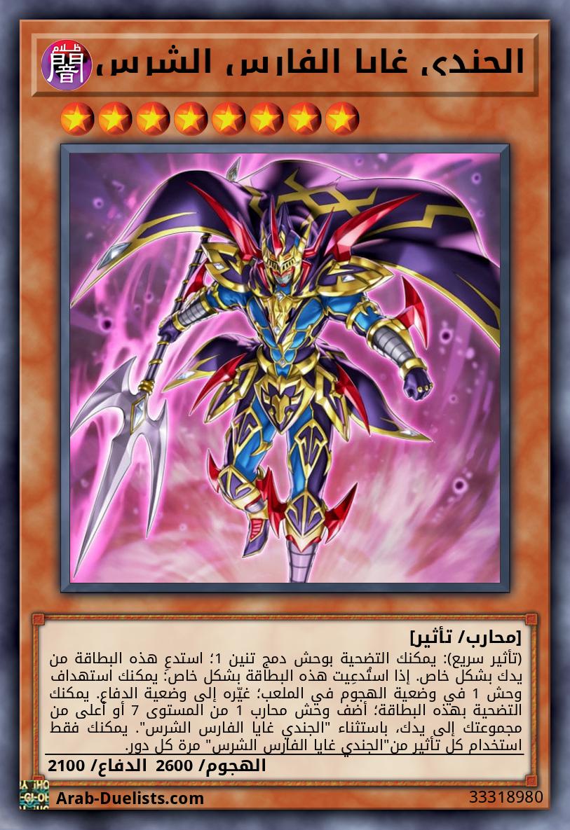 (تأثير سريع): يمكنك التضحية بوحش دمج تنين 1؛ استدعِ هذه البطاقة من يدك بشكل خاص. إذا استُدعِيت هذه البطاقة بشكل خاص: يمكنك استهداف وحش 1 في وضعية الهجوم في الملعب؛ غيّره إلى وضعية الدفاع. يمكنك التضحية بهذه البطاقة؛ أضف وحش محارب 1 من المستوى 7 أو أعلى من مجموعتك إلى يدك، باستثناء "الجندي غايا الفارس الشرس". يمكنك فقط استخدام كل تأثير من"الجندي غايا الفارس الشرس" مرة كل دور.