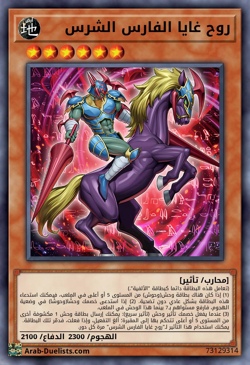 (تعامل هذه البطاقة دائما كبطاقة "الألفية".) (1) إذا كان هناك بطاقة وحش(وحوش) من المستوى 5 أو أعلى في الملعب، فيمكنك استدعاء هذه البطاقة بشكل عادي دون تضحية. (2) إذا استدعى خصمك وحشًا(وحوشًا) في وضعية الهجوم، فارفع مستواهم بـ7 بينما هذا الوحش في الملعب. (3) عندما يفعل خصمك تأثير وحش (تأثير سريع): يمكنك إرسال بطاقة وحش 1 مكشوفة أخرى من المستوى 5 أو أعلى تتحكم بها إلى المقبرة؛ ألغ التفعيل، وإذا فعلت، فدمّر تلك البطاقة. يمكنك استخدام هذا التأثير لـ"روح غايا الفارس الشرس" مرة كل دور.