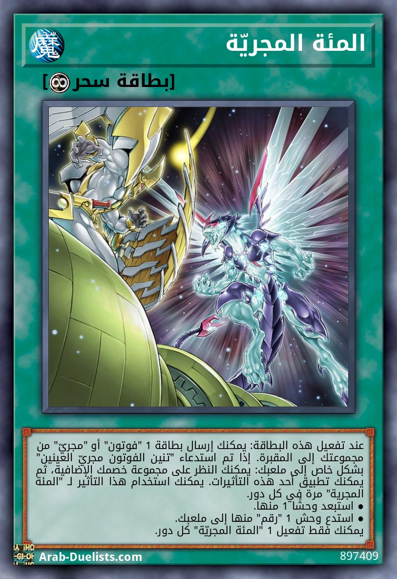 عند تفعيل هذه البطاقة: يمكنك إرسال بطاقة 1 "فوتون" أو "مجريّ" من مجموعتك إلى المقبرة. إذا تم استدعاء "تنين الفوتون مجريّ العينين" بشكل خاص إلى ملعبك: يمكنك النظر على مجموعة خصمك الإضافية، ثم يمكنك تطبيق أحد هذه التأثيرات. يمكنك استخدام هذا التأثير لـ "المئة المجرية" مرة في كل دور. ● استبعد وحشًا 1 منها. ● استدع وحش 1 "رقم" منها إلى ملعبك. يمكنك فقط تفعيل 1 "المئة المجريّة" كل دور.