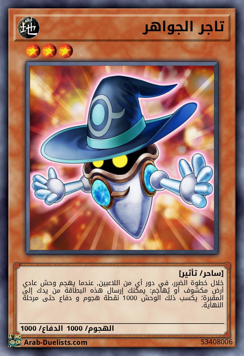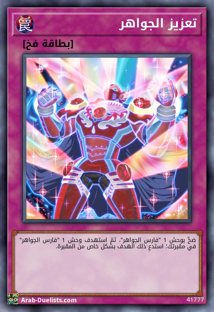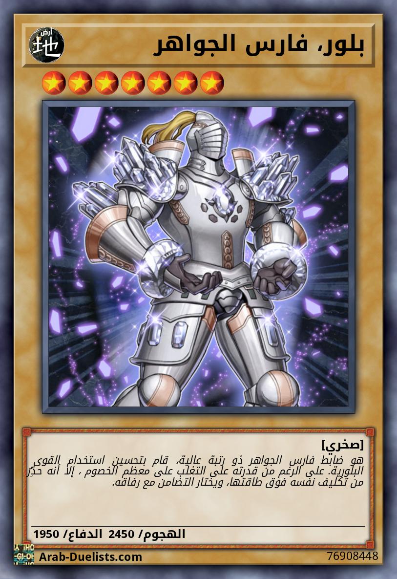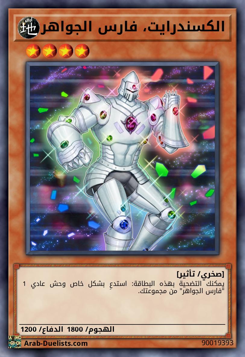 تُعامل هذه البطاقة كوحش عادي بينما هي مكشوفة على الملعب أو في المقبرة. بينما هذه البطاقة مكشوفة على الملعب، يمكنك استدعاؤها بشكل عادي لتصبح وحش تأثير مع هذا التأثير. ● مرة واحدة كل دور: يمكنك استبعاد وحش 1 "جواهر" من مقبرتك لاستهداف بطاقة 1 "فارس الجواهر" في مقبرتك؛ أضف ذلك الهدف إلى يدك.