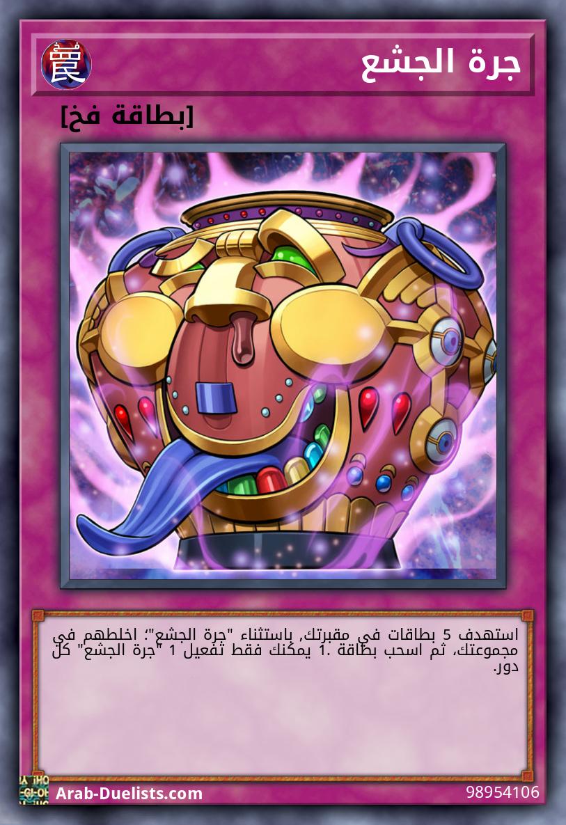 استهدف 5 بطاقات في مقبرتك, باستثناء "جرة الجشع"؛ اخلطهم في مجموعتك، ثم اسحب بطاقة 1. يمكنك فقط تفعيل 1 "جرة الجشع" كل دور.