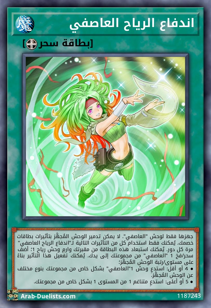 جهزها فقط لوحش "العاصفي". لا يمكن تدمير الوحش المُجهَّز بتأثيرات بطاقات خصمك. يُمكنك فقط استخدام كل من التأثيرات التالية لـ"اندفاع الرياح العاصفي" مرة كل دور. يُمكنك استبعاد هذه البطاقة من مقبرتك وارمِ وحش رياح 1؛ أضف سحر/فخ 1 "العاصفي" من مجموعتك إلى يدك. يُمكنك تفعيل هذا التأثير بناءً على مستوى/رتبة الوحش المُجهَّز؛ ● 4 أو أقل: استدعِ وحش 1"العاصفي" بشكل خاص من مجموعتك بنوع مختلف عن الوحش المُجهَّز. ● 5 أو أعلى: استدعِ متناغم 1 من المستوى 1 بشكل خاص من مجموعتك.